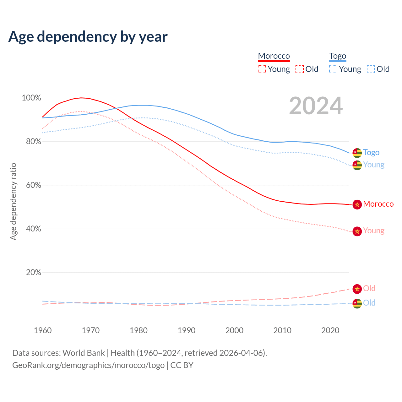 - Morocco is ranked 100/196 by median age (oldest to youngest) vs 166/196 for Togo.