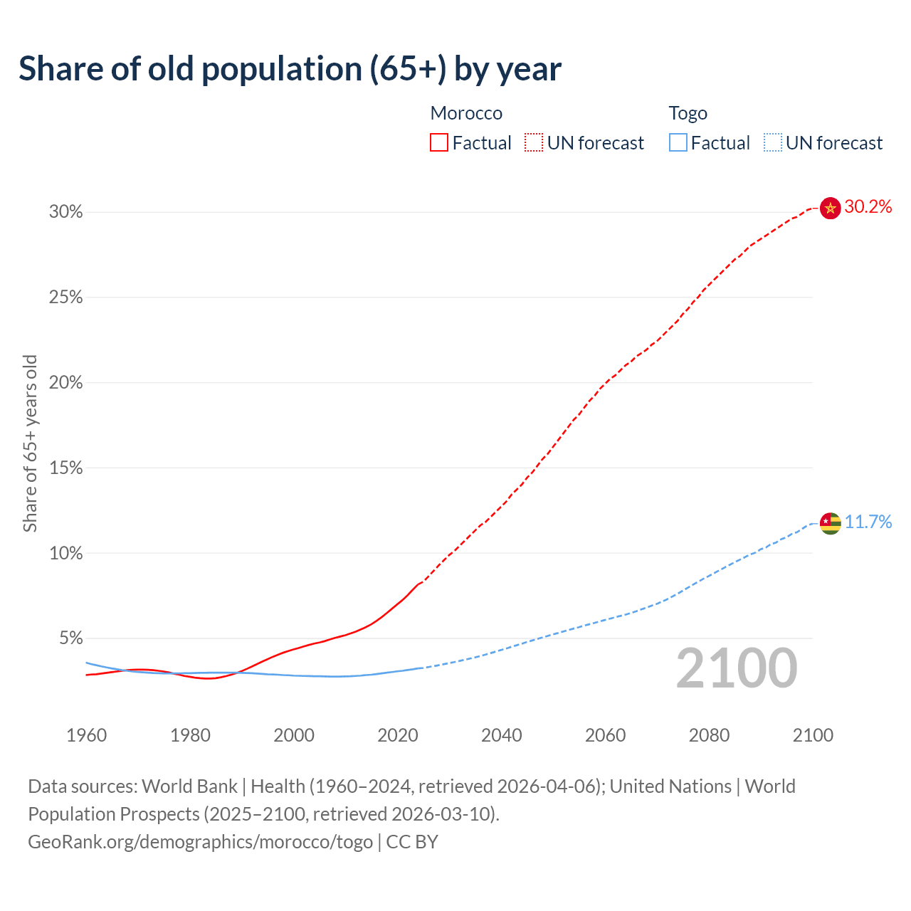 - The share of old-age demographic (65+) in Morocco is 8.14% vs 3.21% in Togo.