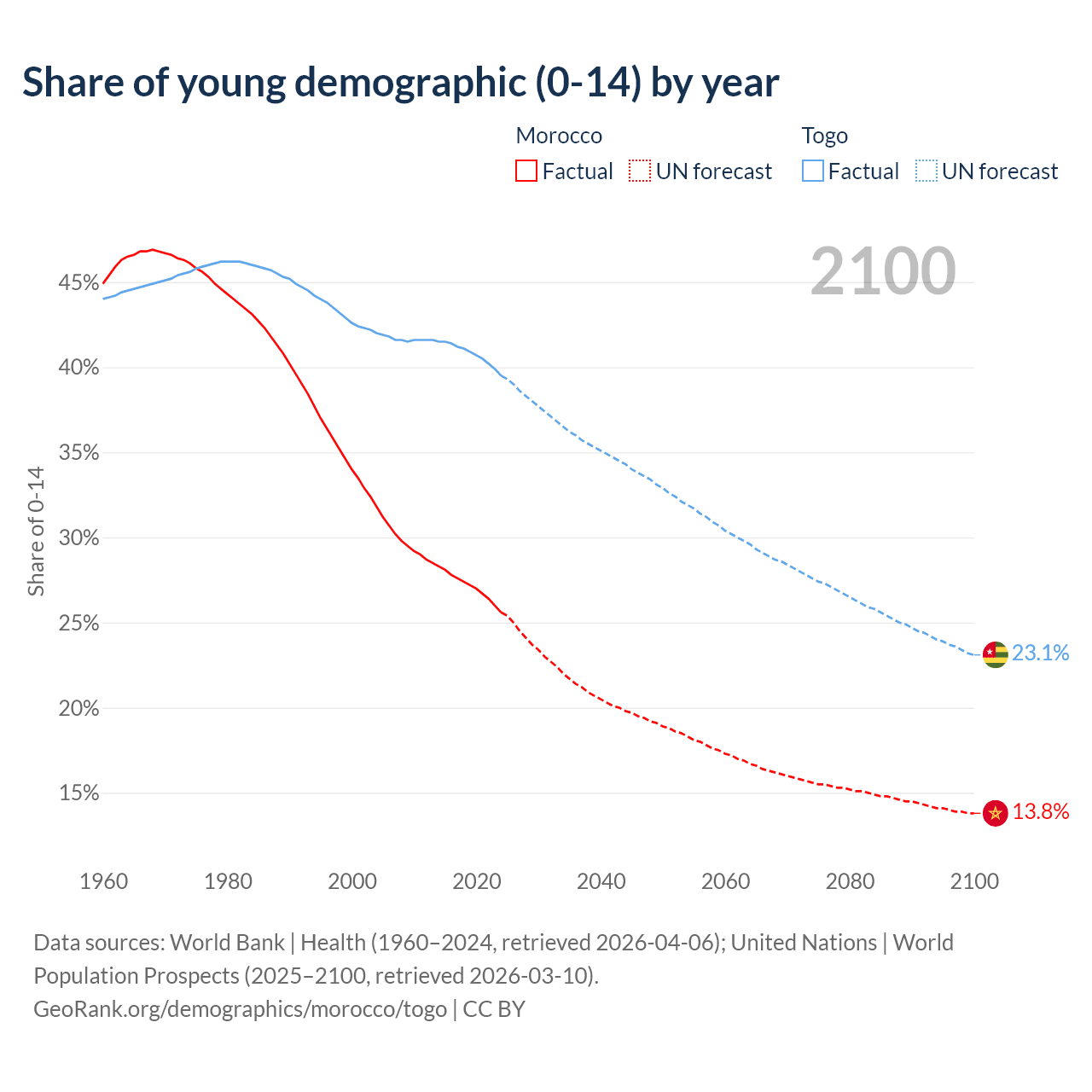 Median age Morocco vs Togo, 1960-2100