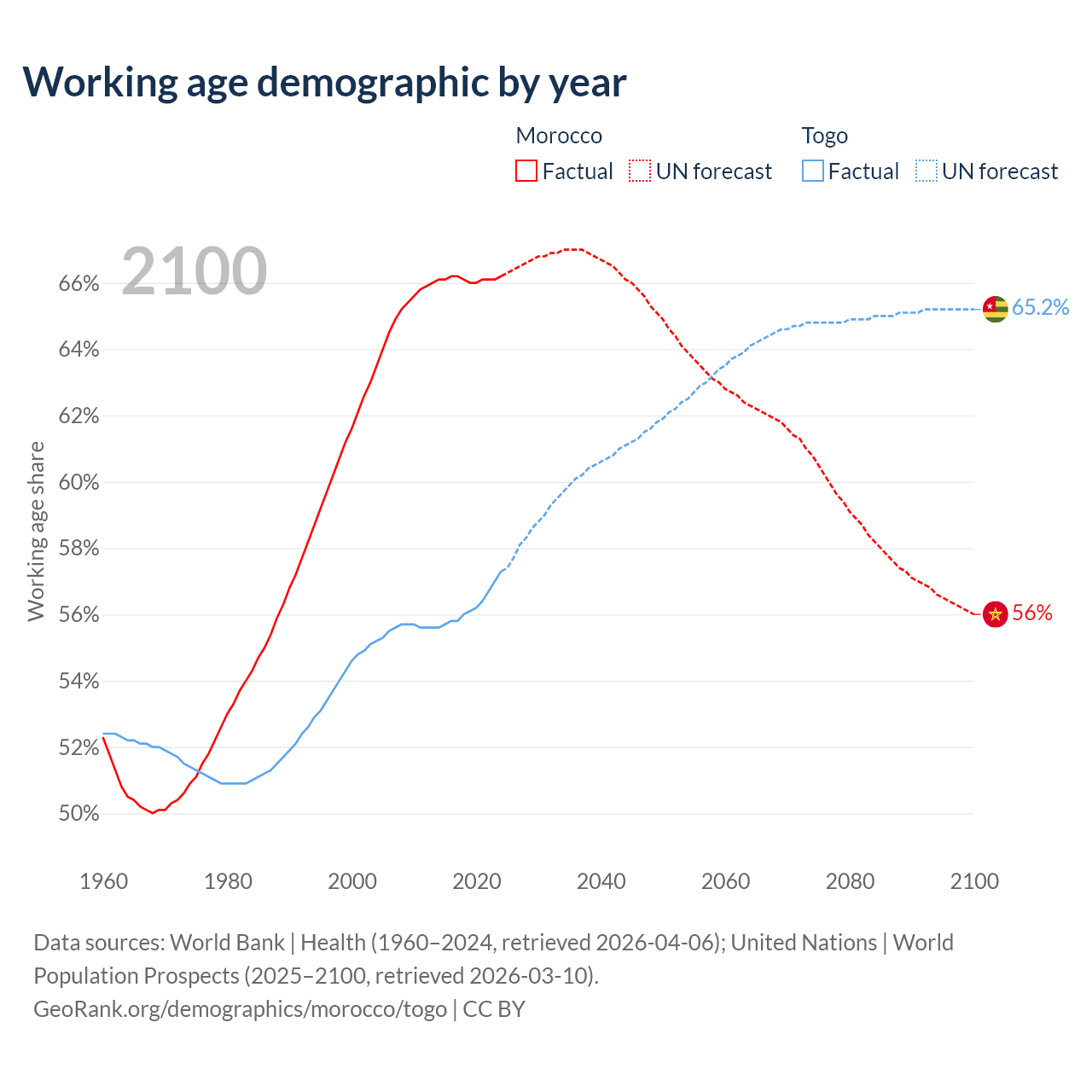 - Morocco has 25.7M working age adults (aged 15-64) vs 5.72M in Togo.