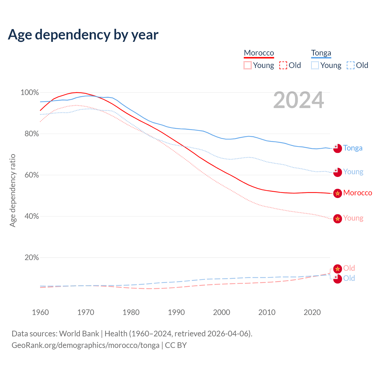 - The share of old-age demographic (65+) in Morocco is 8.14% vs 6.72% in Tonga.
