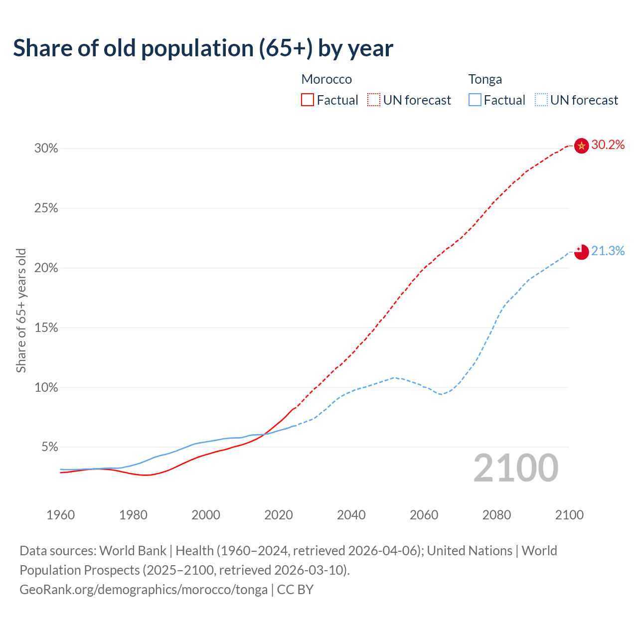 The share of older people aged 65 and over is 8.14% in Morocco and 6.72% in Tonga. Life expectancy in Morocco compared to Tonga .