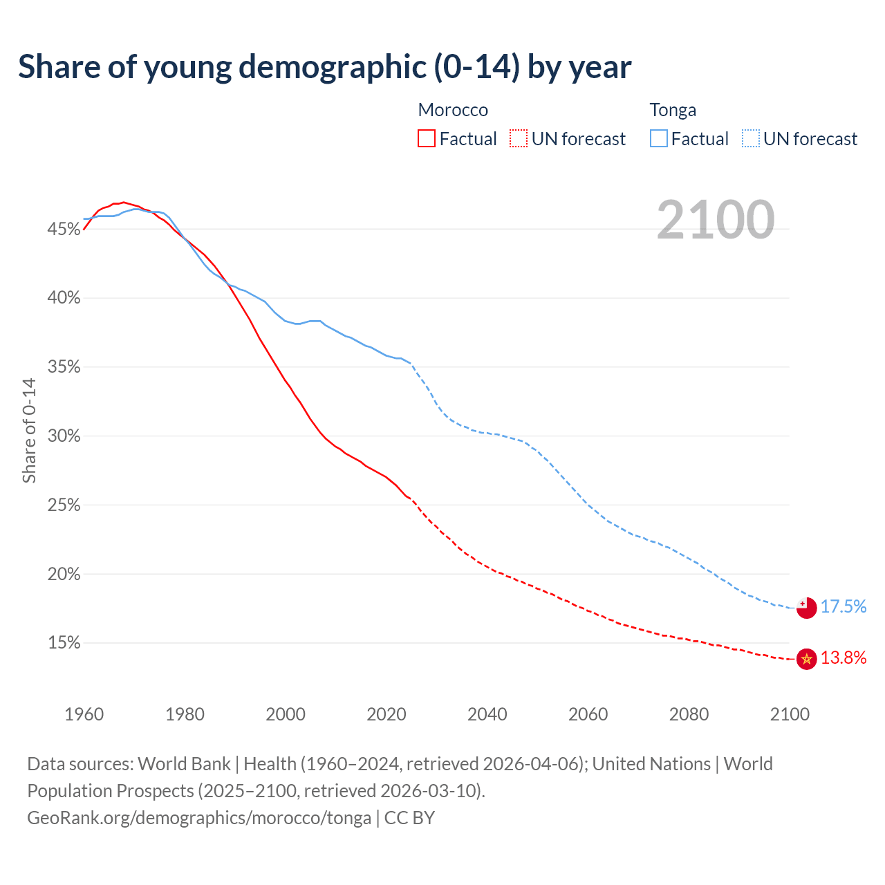 - The share of young demographic (0-15 years old) in Morocco is 25.6% vs 35.4% in Tonga.