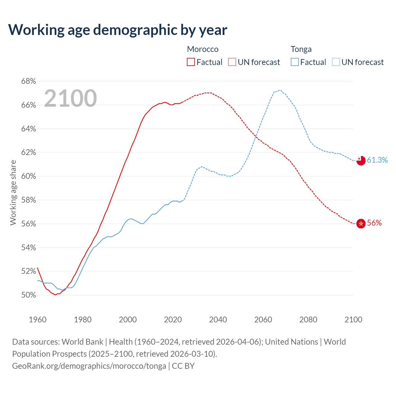 - Morocco has 25.7M working age adults (aged 15-64) vs 59.8K in Tonga.