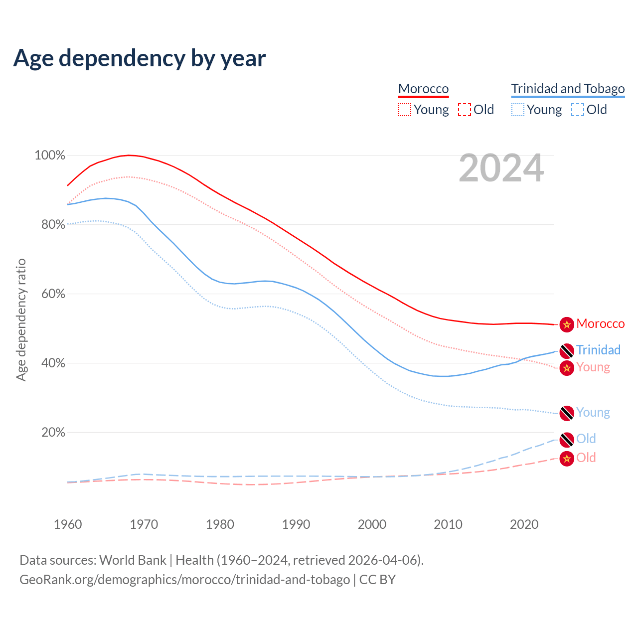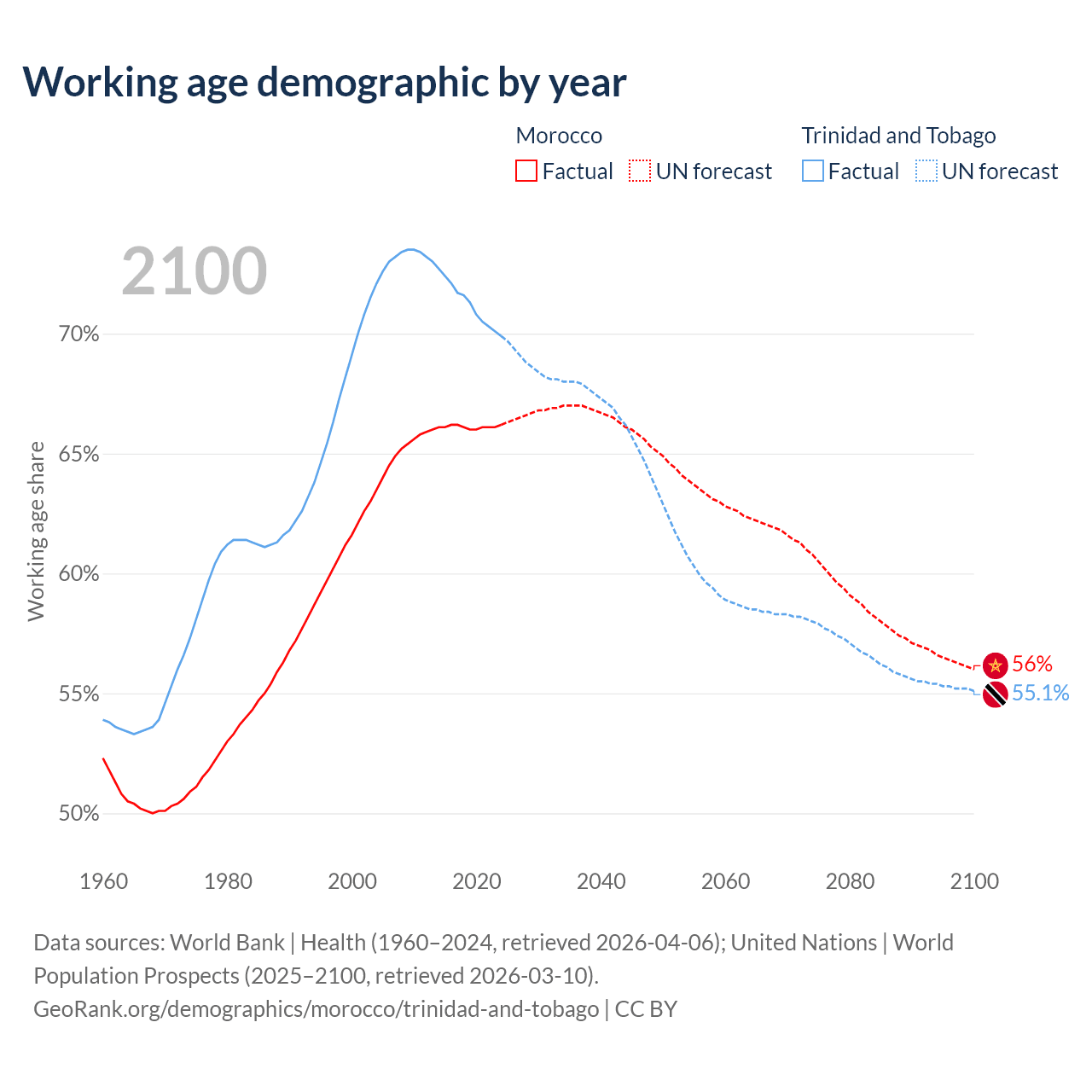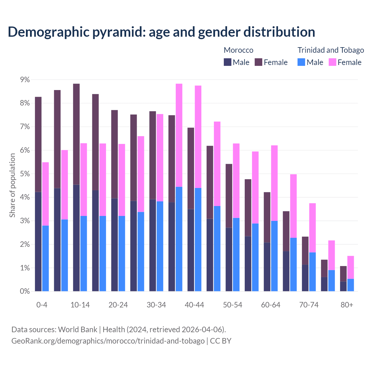 The share of older people aged 65 and over is 8.14% in Morocco and 12.4% in Trinidad and Tobago. Life expectancy in Morocco compared to Trinidad and Tobago .