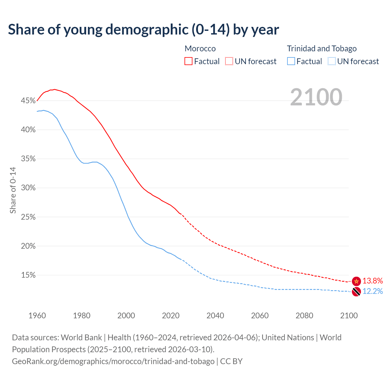 - The share of young demographic (0-15 years old) in Morocco is 25.6% vs 17.8% in Trinidad and Tobago.