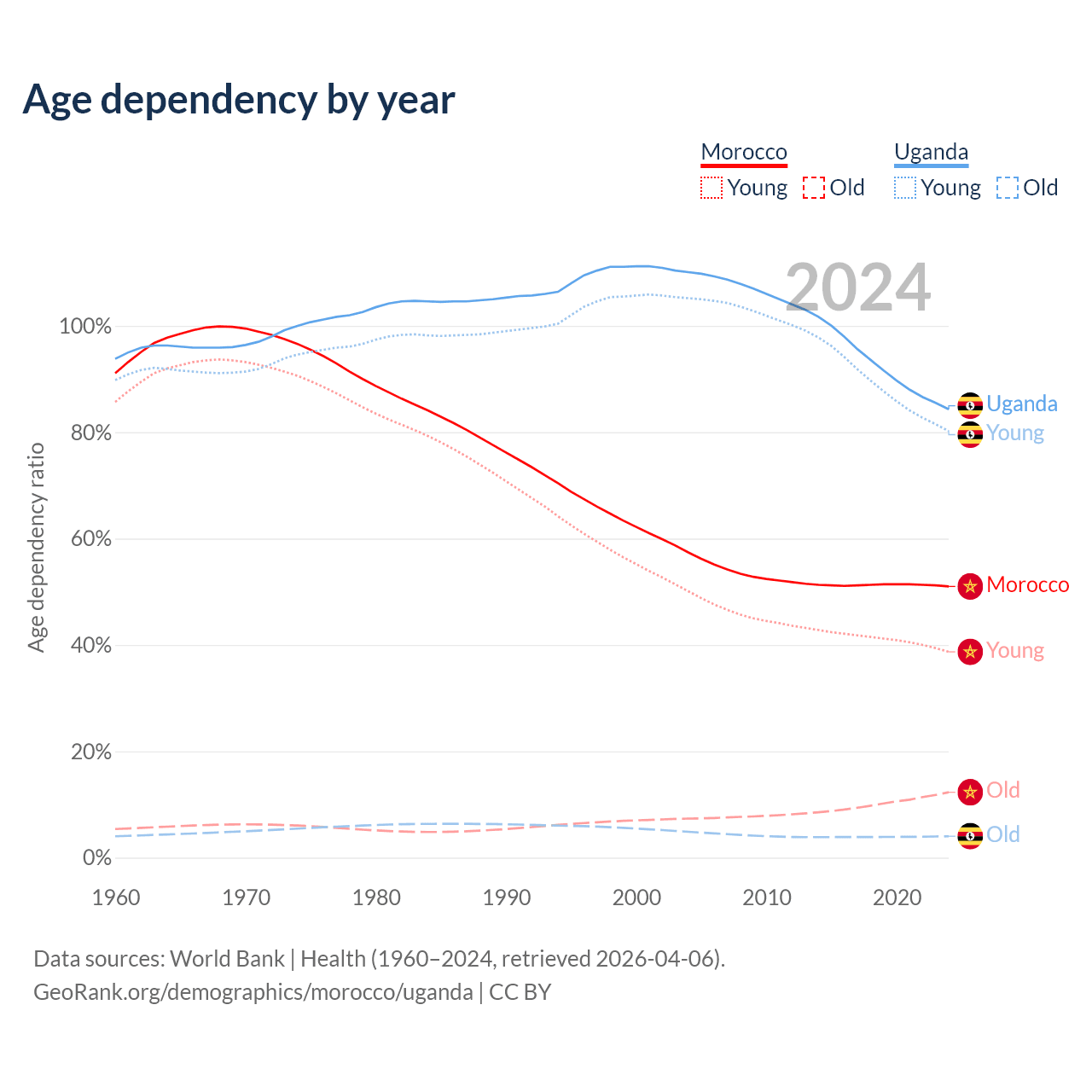 - Morocco is ranked 100/196 by median age (oldest to youngest) vs 187/196 for Uganda.