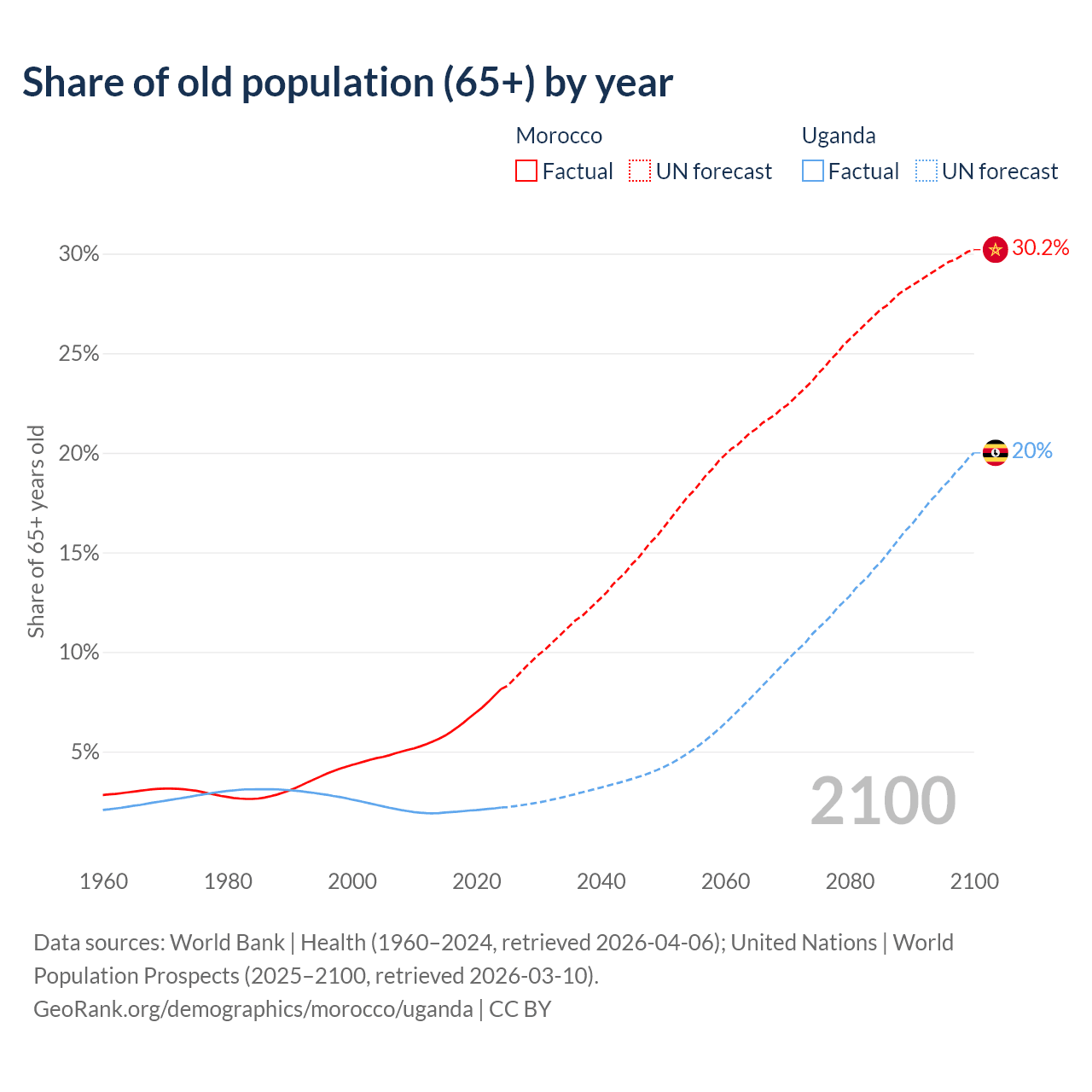 The share of older people aged 65 and over is 8.14% in Morocco and 2.19% in Uganda. Life expectancy in Morocco compared to Uganda .