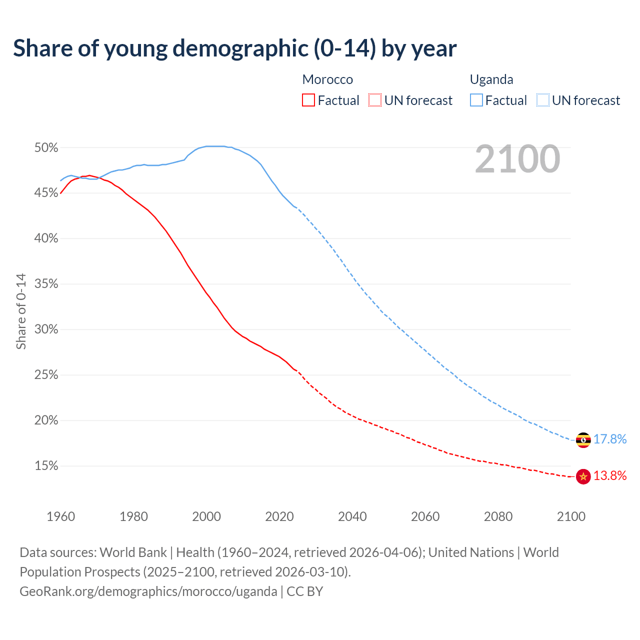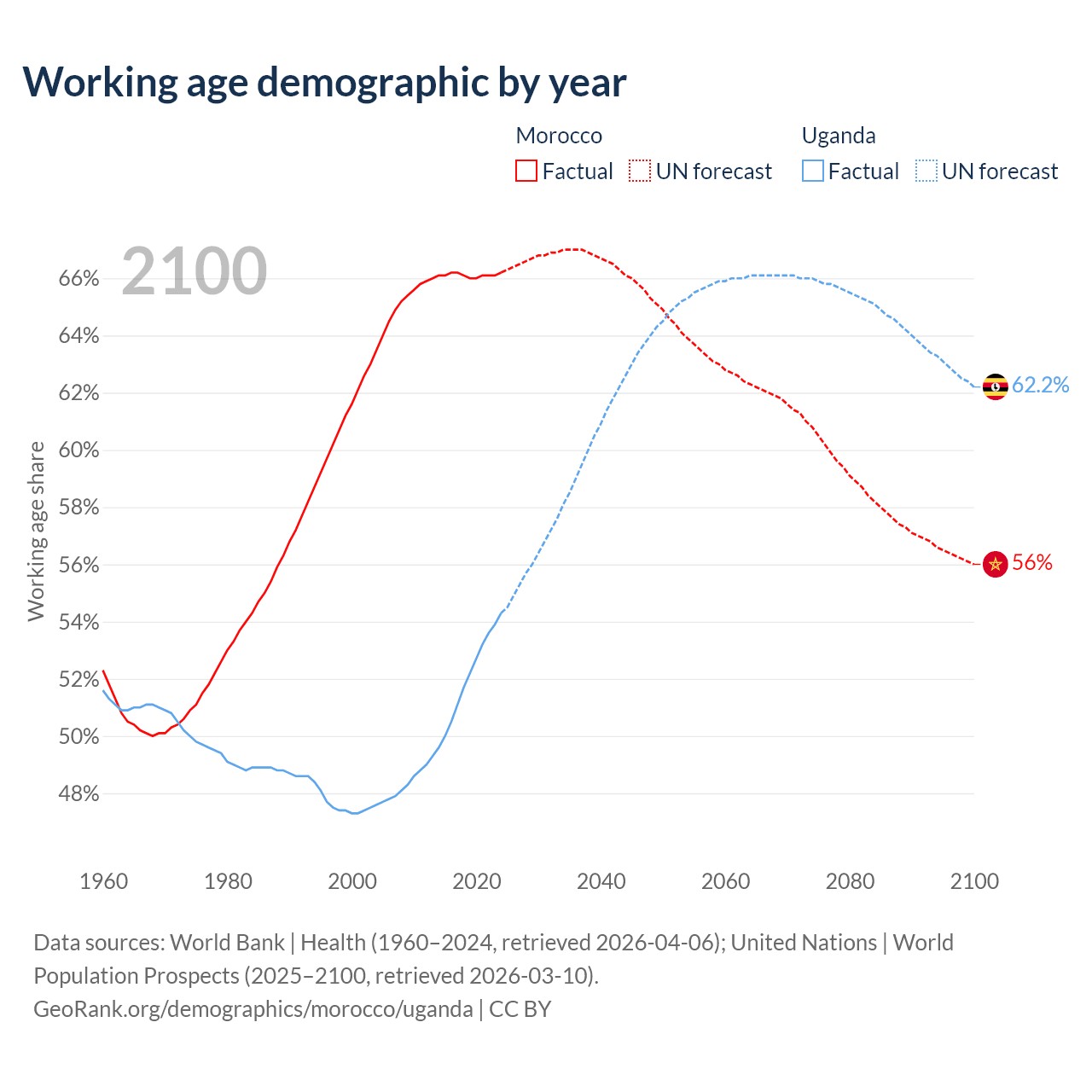Median age Morocco vs Uganda, 1960-2100