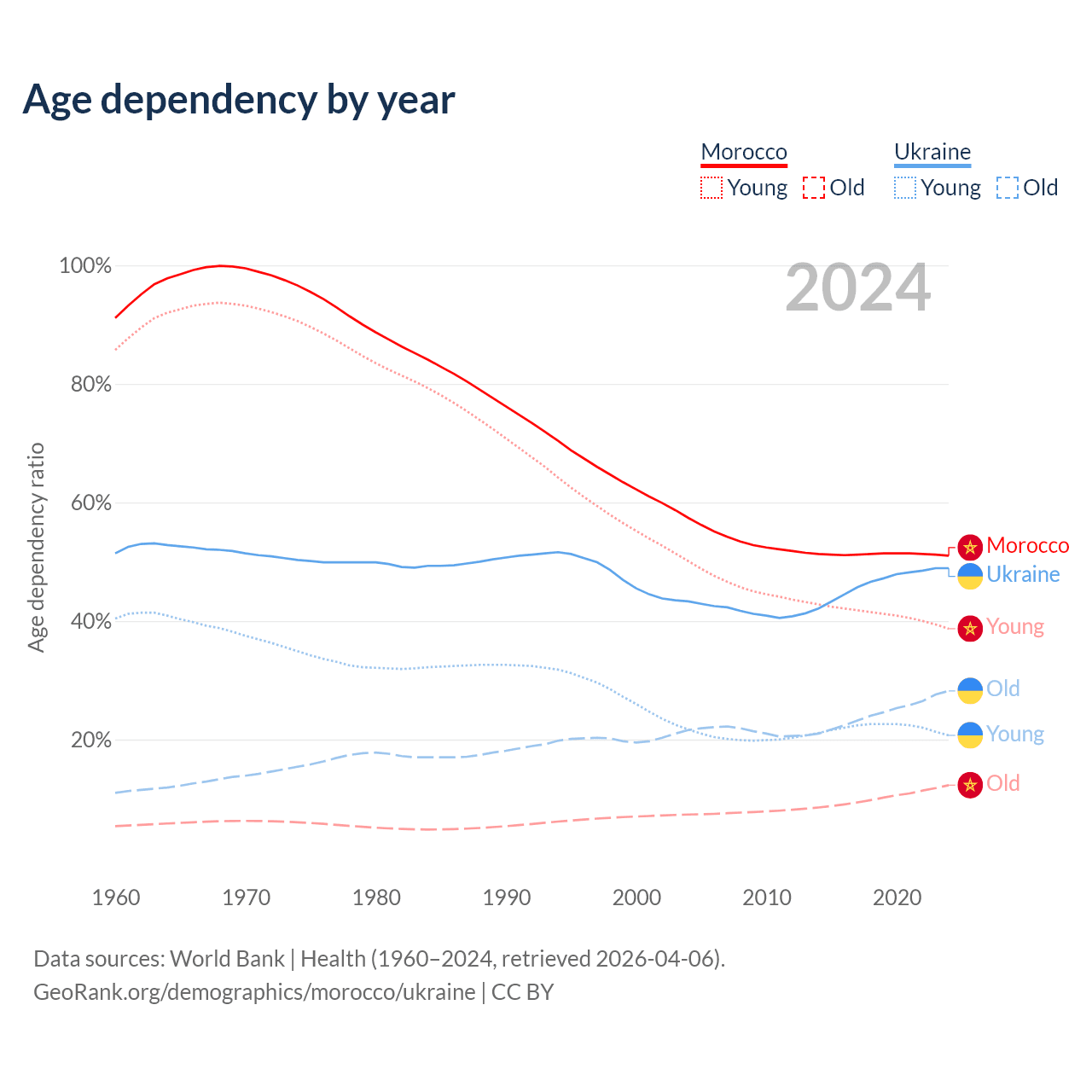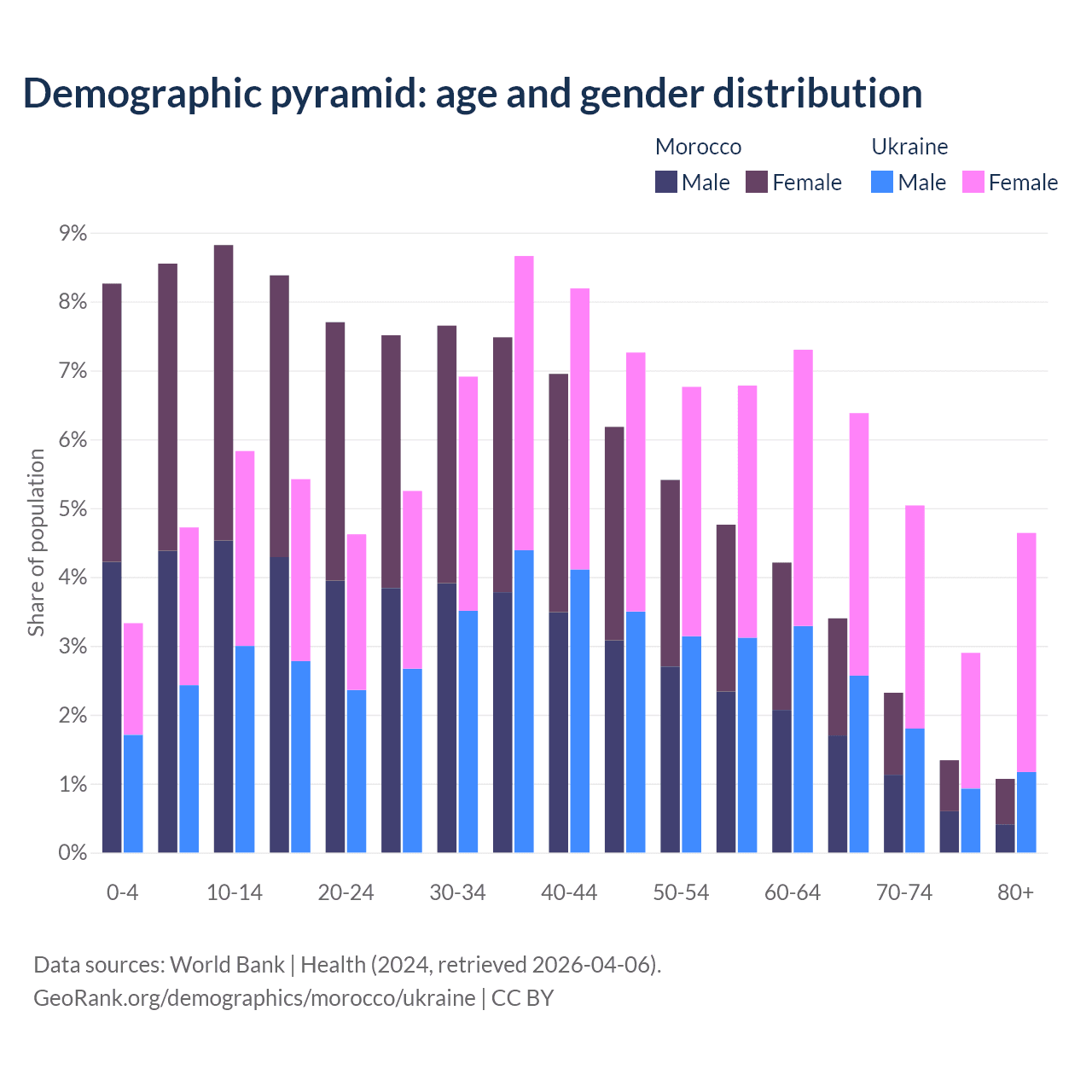 - Morocco is ranked 100/196 by median age (oldest to youngest) vs 26/196 for Ukraine.