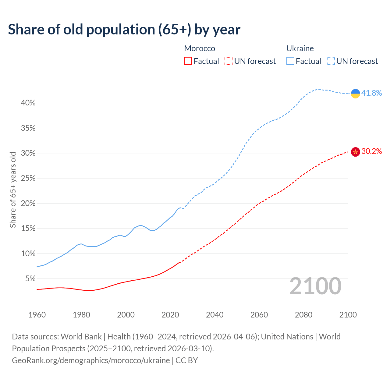 The share of older people aged 65 and over is 8.14% in Morocco and 19% in Ukraine. Life expectancy in Morocco compared to Ukraine .
