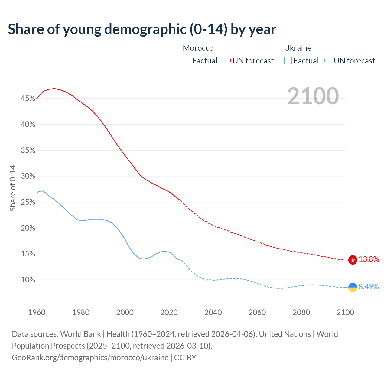 - The share of young demographic (0-15 years old) in Morocco is 25.6% vs 13.9% in Ukraine.