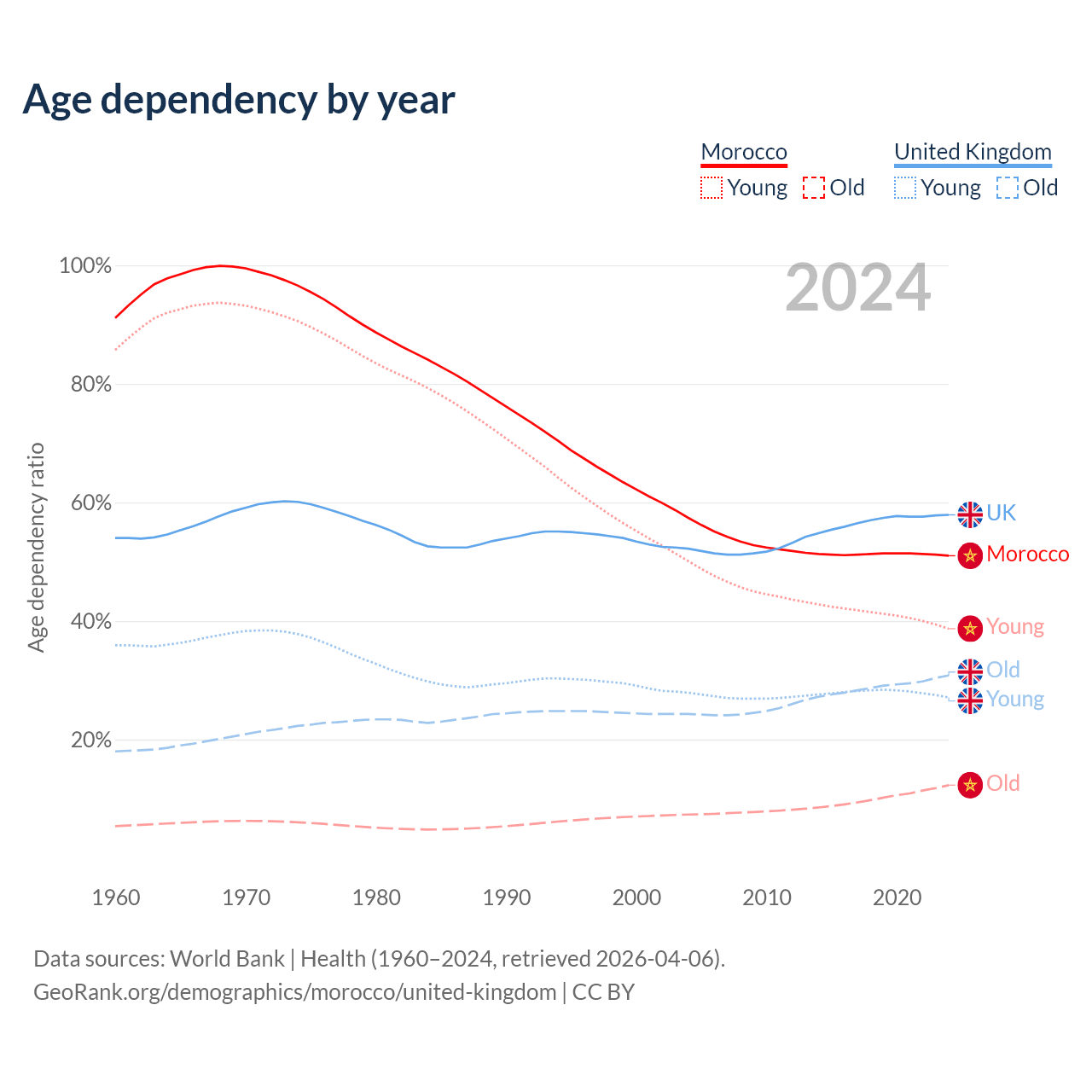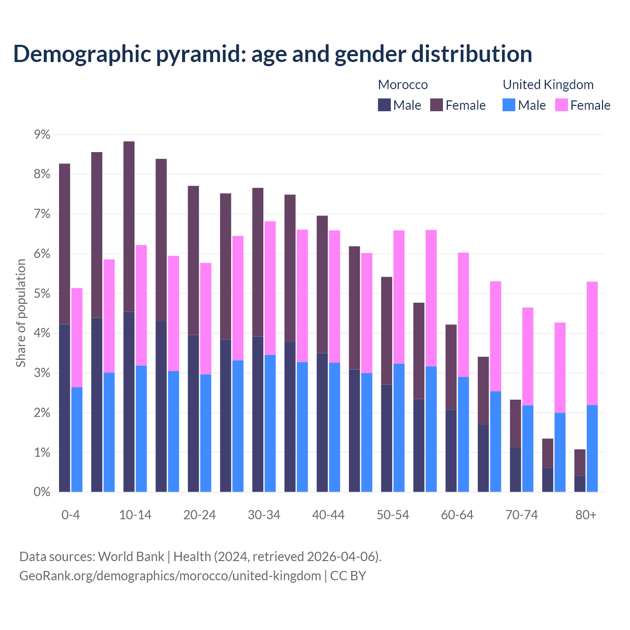 - Morocco is ranked 100/196 by median age (oldest to youngest) vs 41/196 for the United Kingdom.