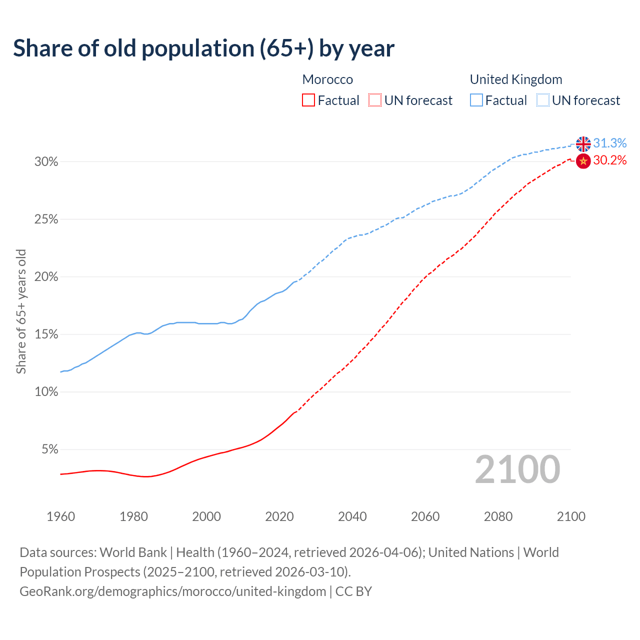 The share of older people aged 65 and over is 8.14% in Morocco and 19.5% in the United Kingdom. Life expectancy in Morocco compared to the United Kingdom .