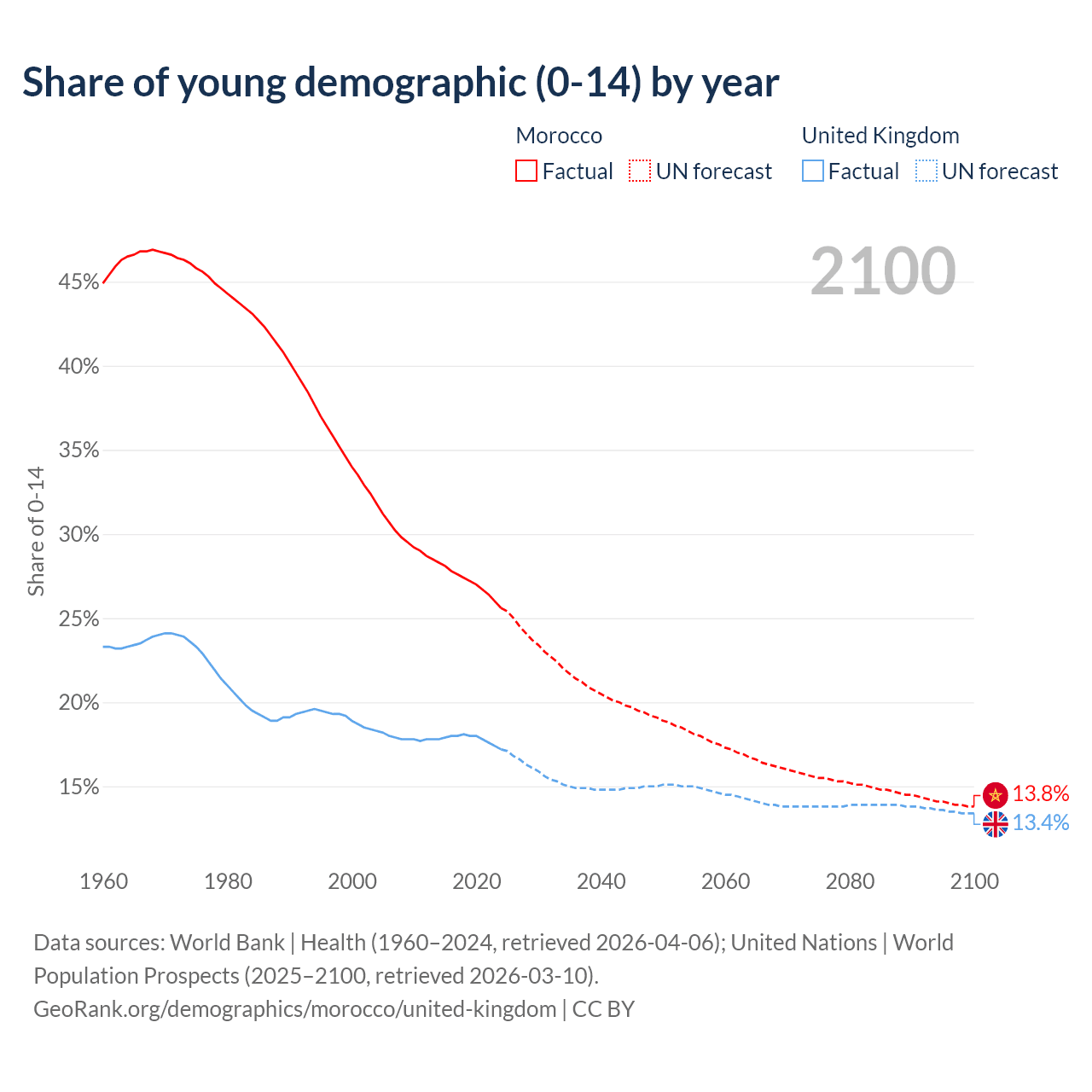 - The share of young demographic (0-15 years old) in Morocco is 25.6% vs 17.2% in the United Kingdom.