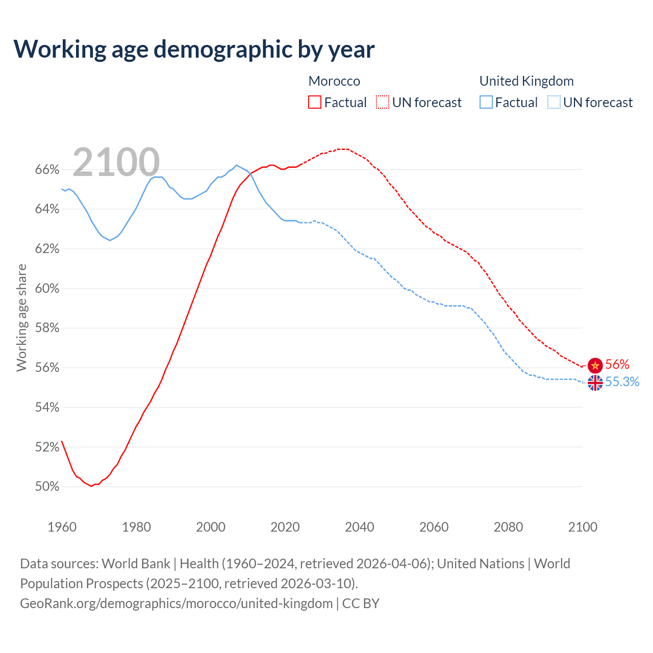 - Morocco has 25.7M working age adults (aged 15-64) vs 44.4M in the United Kingdom.