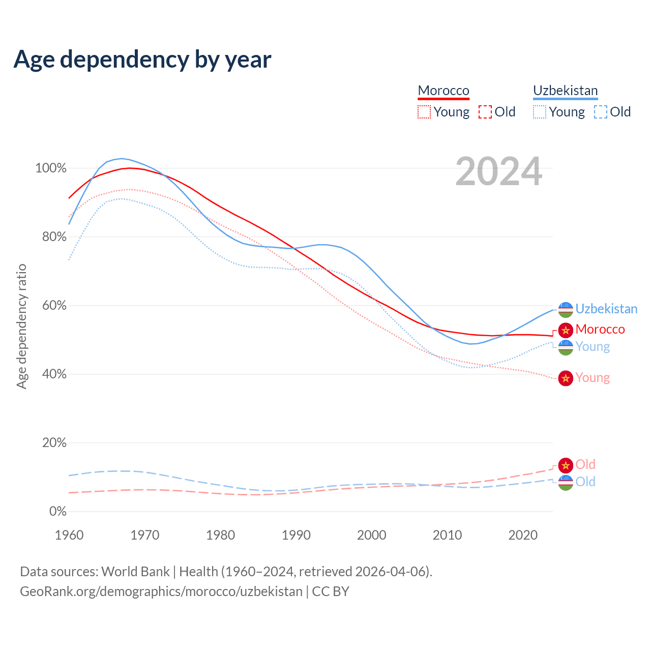 - Morocco is ranked 100/196 by median age (oldest to youngest) vs 116/196 for Uzbekistan.