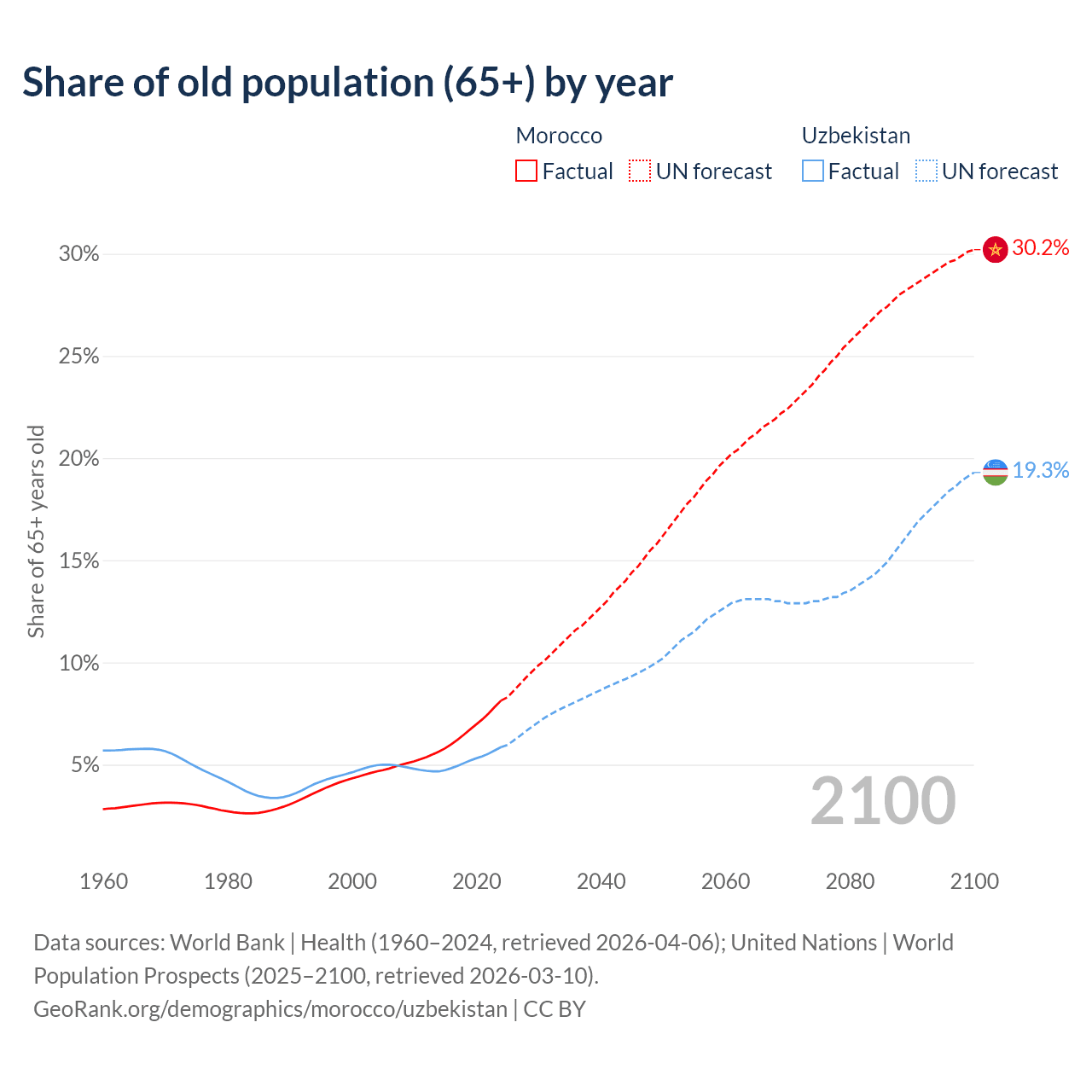 The share of older people aged 65 and over is 8.14% in Morocco and 5.86% in Uzbekistan. Life expectancy in Morocco compared to Uzbekistan .