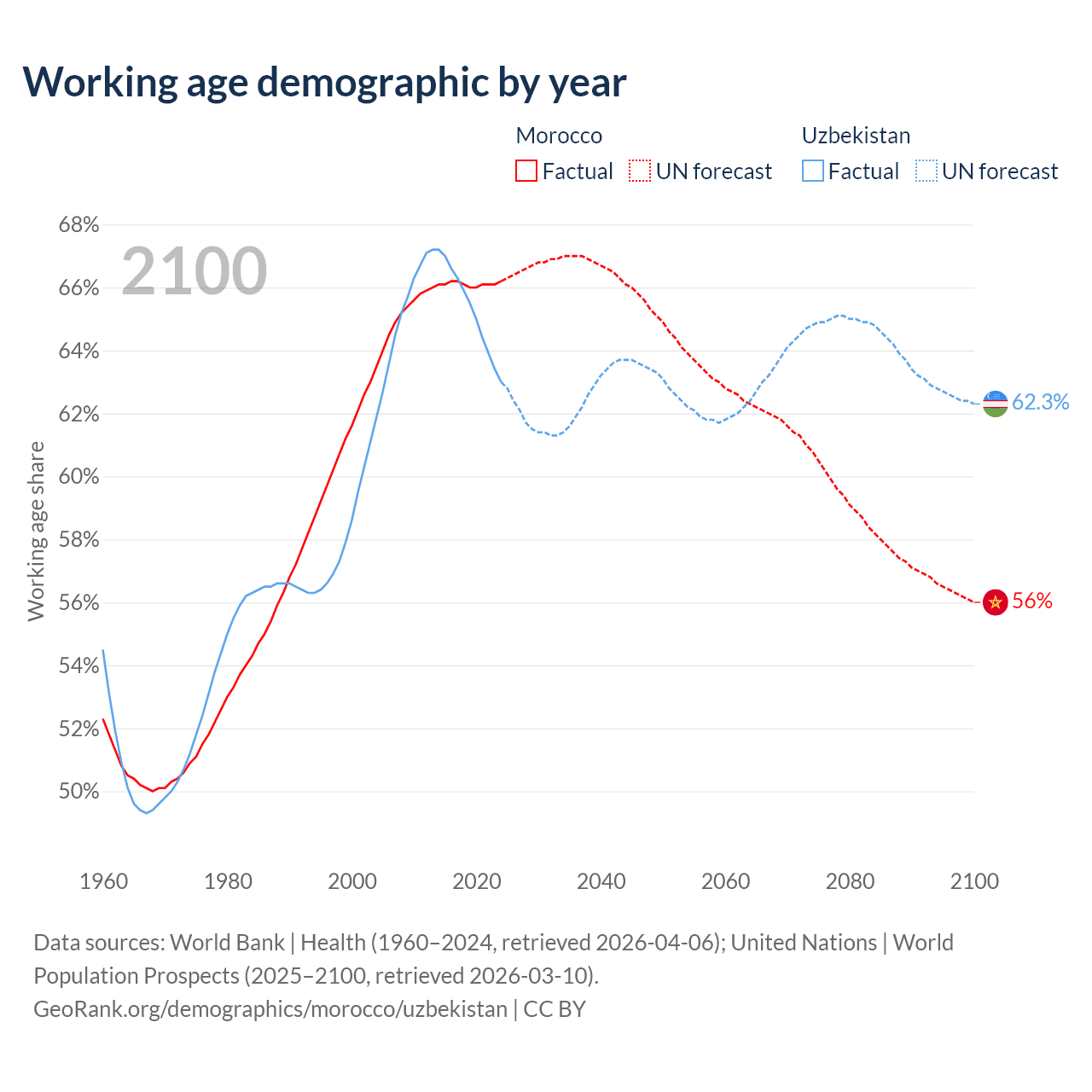 - Morocco has 25.7M working age adults (aged 15-64) vs 23.9M in Uzbekistan.