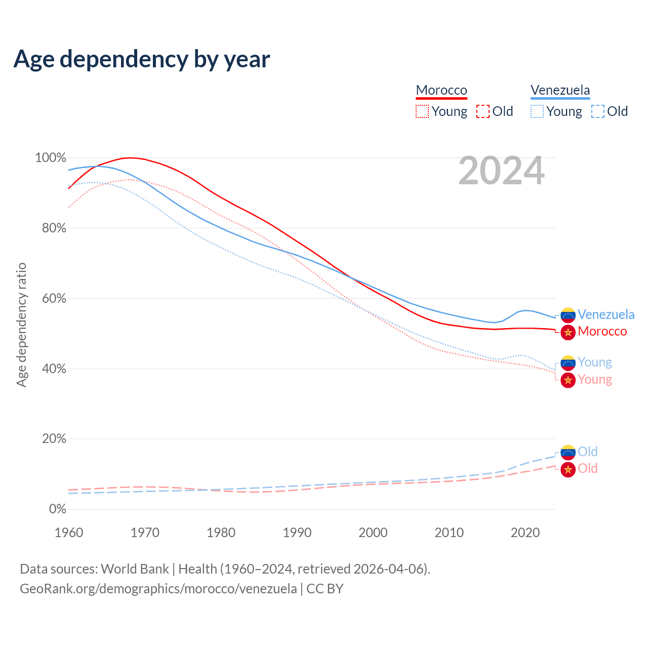 - Morocco is ranked 100/196 by median age (oldest to youngest) vs 104/196 for Venezuela.