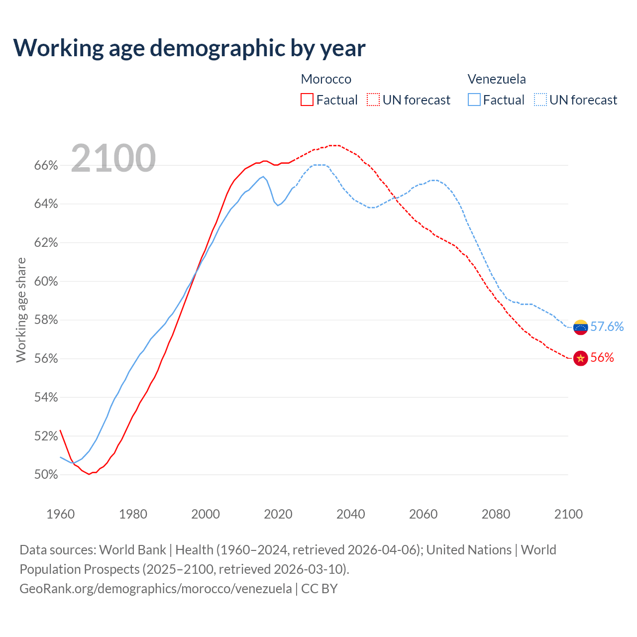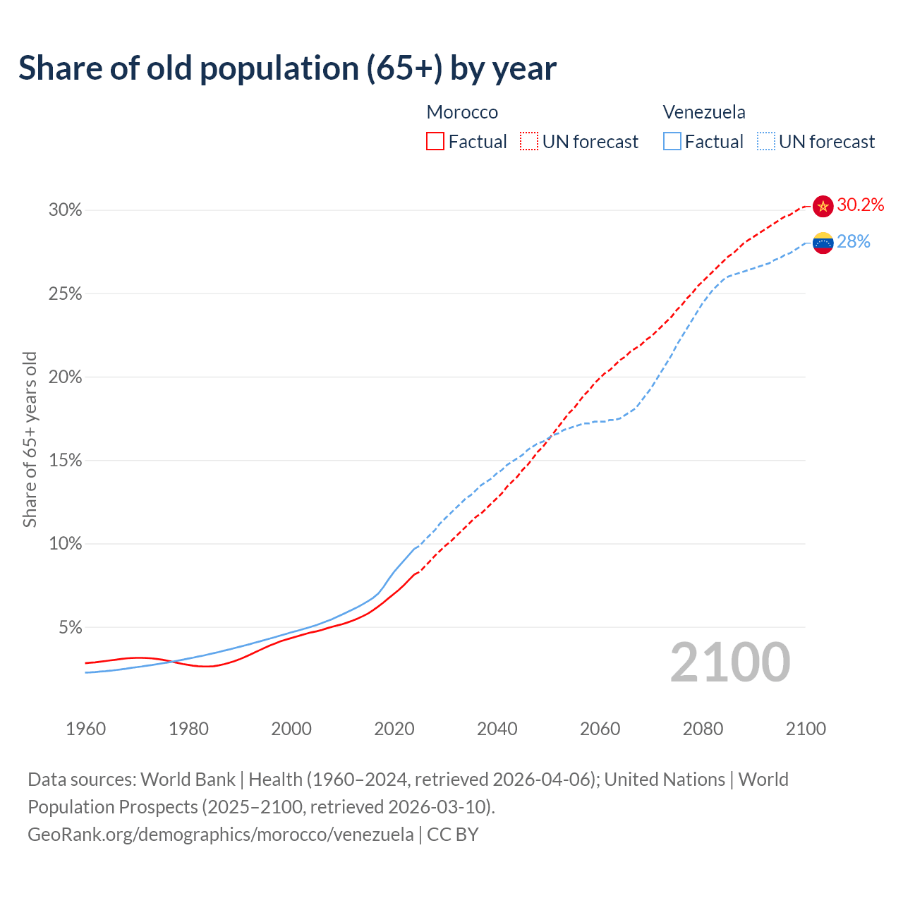 Median age Morocco vs Venezuela, 1960-2100