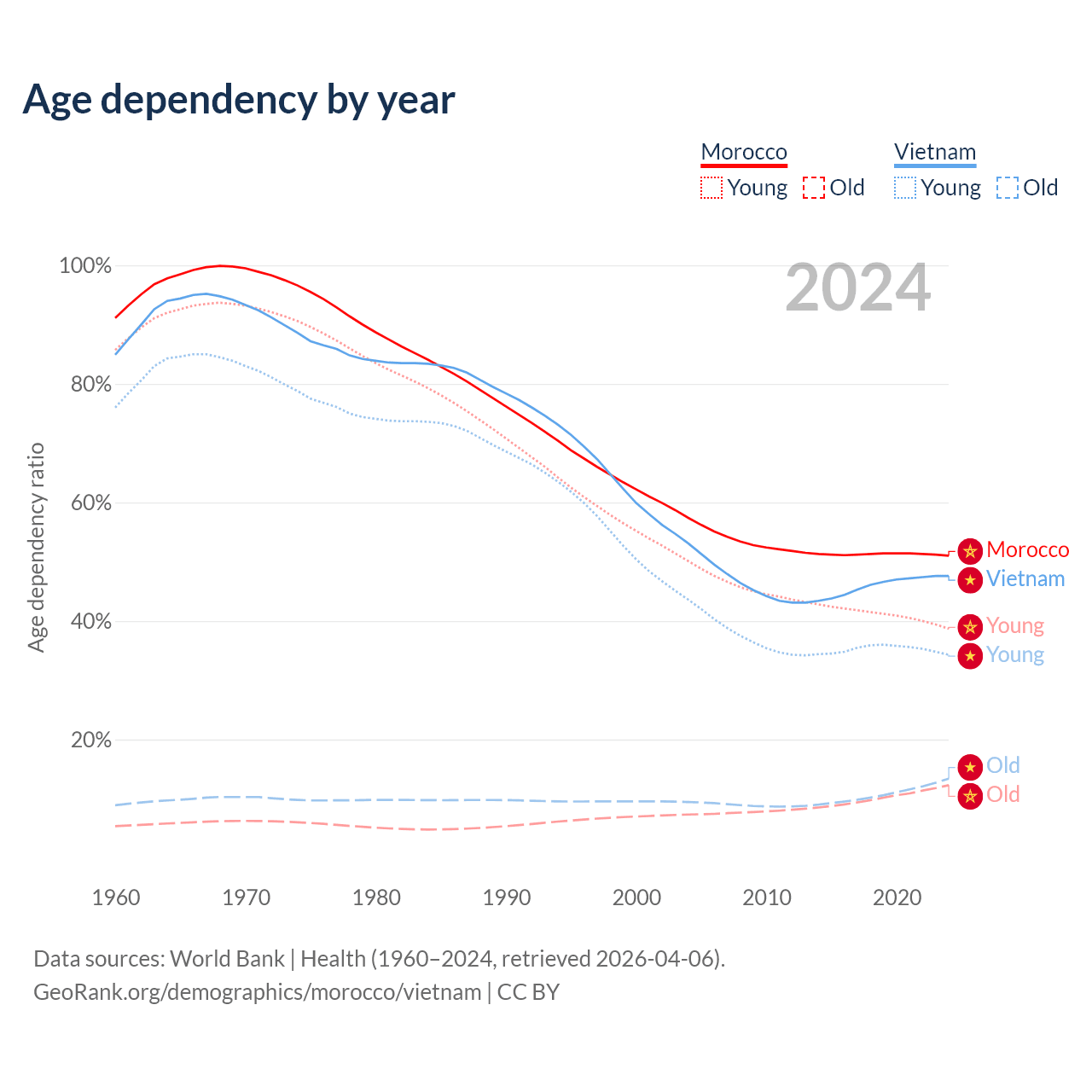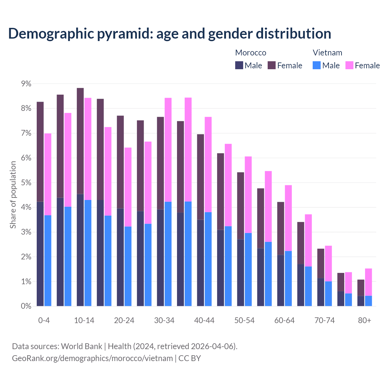 - Morocco is ranked 100/196 by median age (oldest to youngest) vs 84/196 for Vietnam.