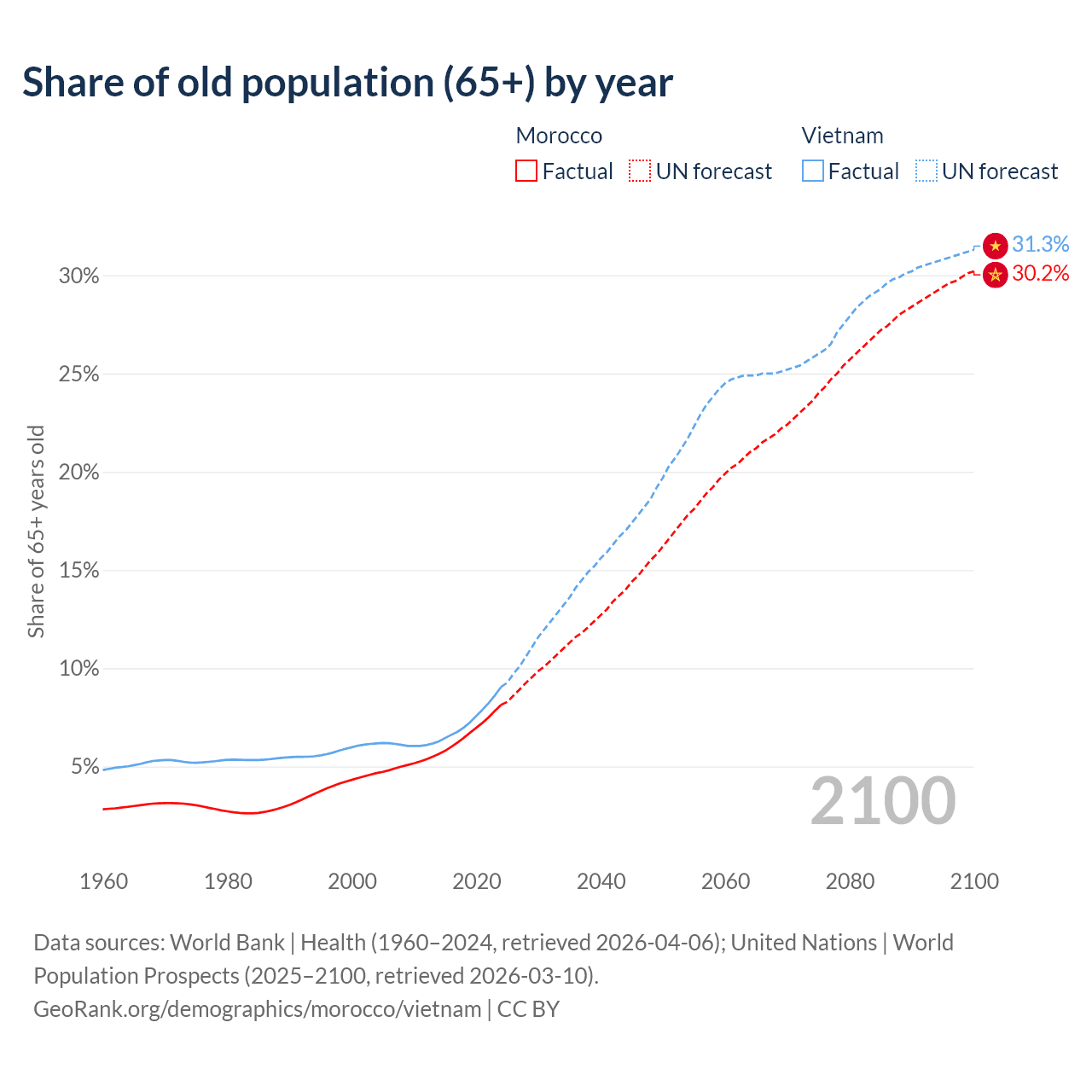 The share of older people aged 65 and over is 8.14% in Morocco and 9.05% in Vietnam. Life expectancy in Morocco compared to Vietnam .