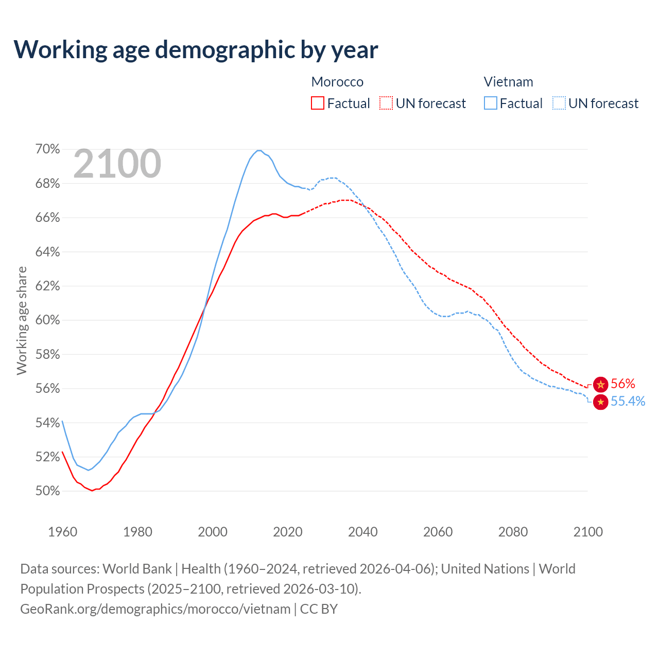 - Morocco has 25.7M working age adults (aged 15-64) vs 69.3M in Vietnam.