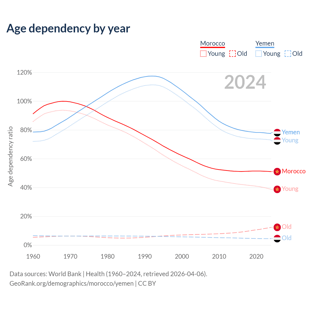 - The share of old-age demographic (65+) in Morocco is 8.14% vs 2.52% in Yemen.