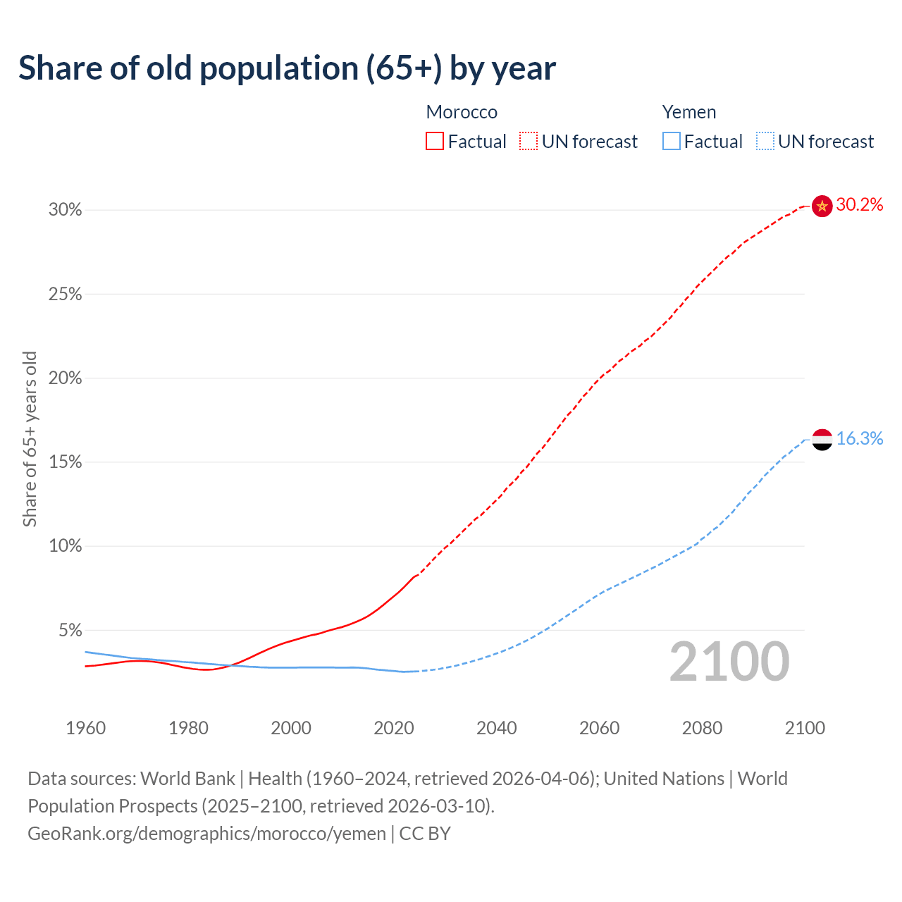 The share of older people aged 65 and over is 8.14% in Morocco and 2.52% in Yemen. Life expectancy in Morocco compared to Yemen .