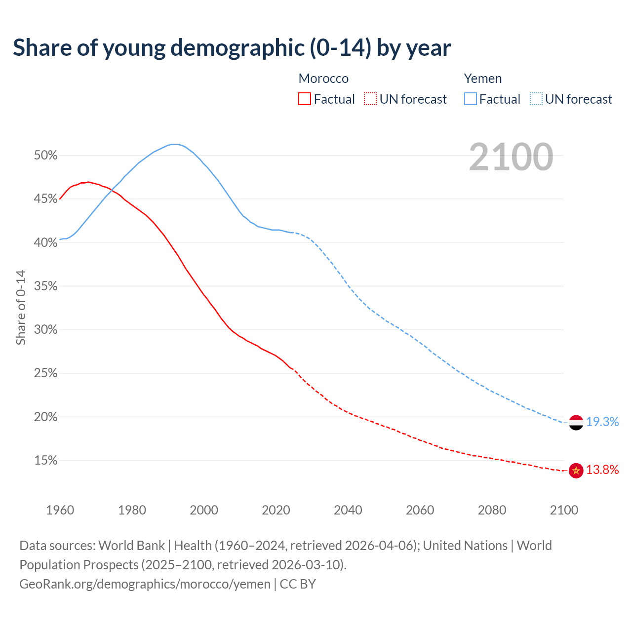 - The share of young demographic (0-15 years old) in Morocco is 25.6% vs 41.1% in Yemen.