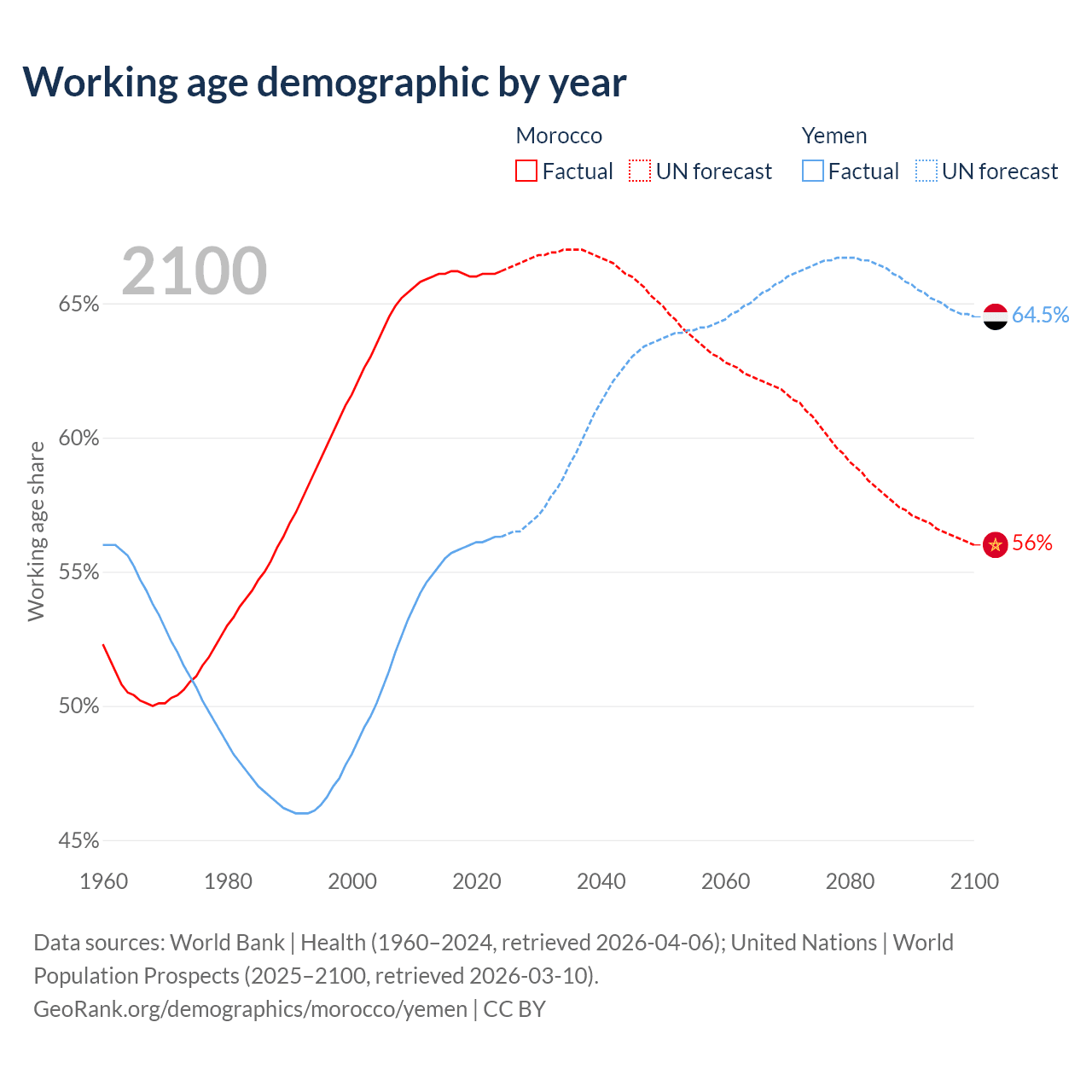 Median age Morocco vs Yemen, 1960-2100