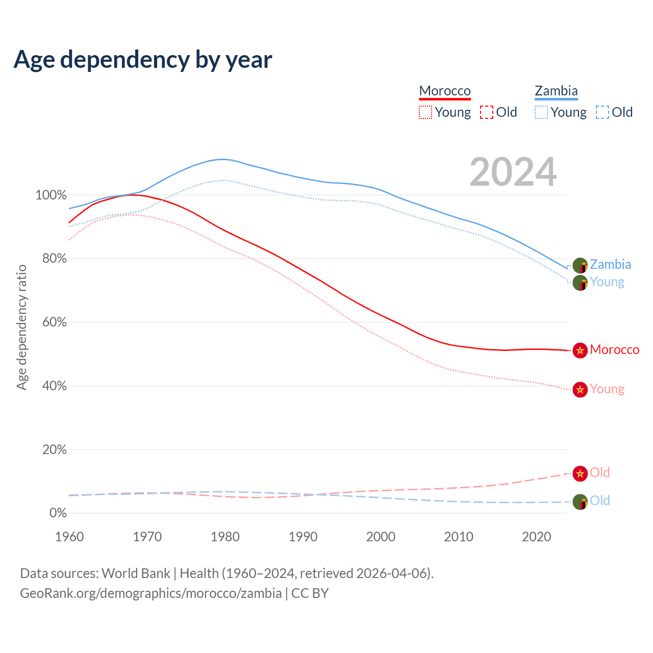 - Morocco is ranked 100/196 by median age (oldest to youngest) vs 182/196 for Zambia.