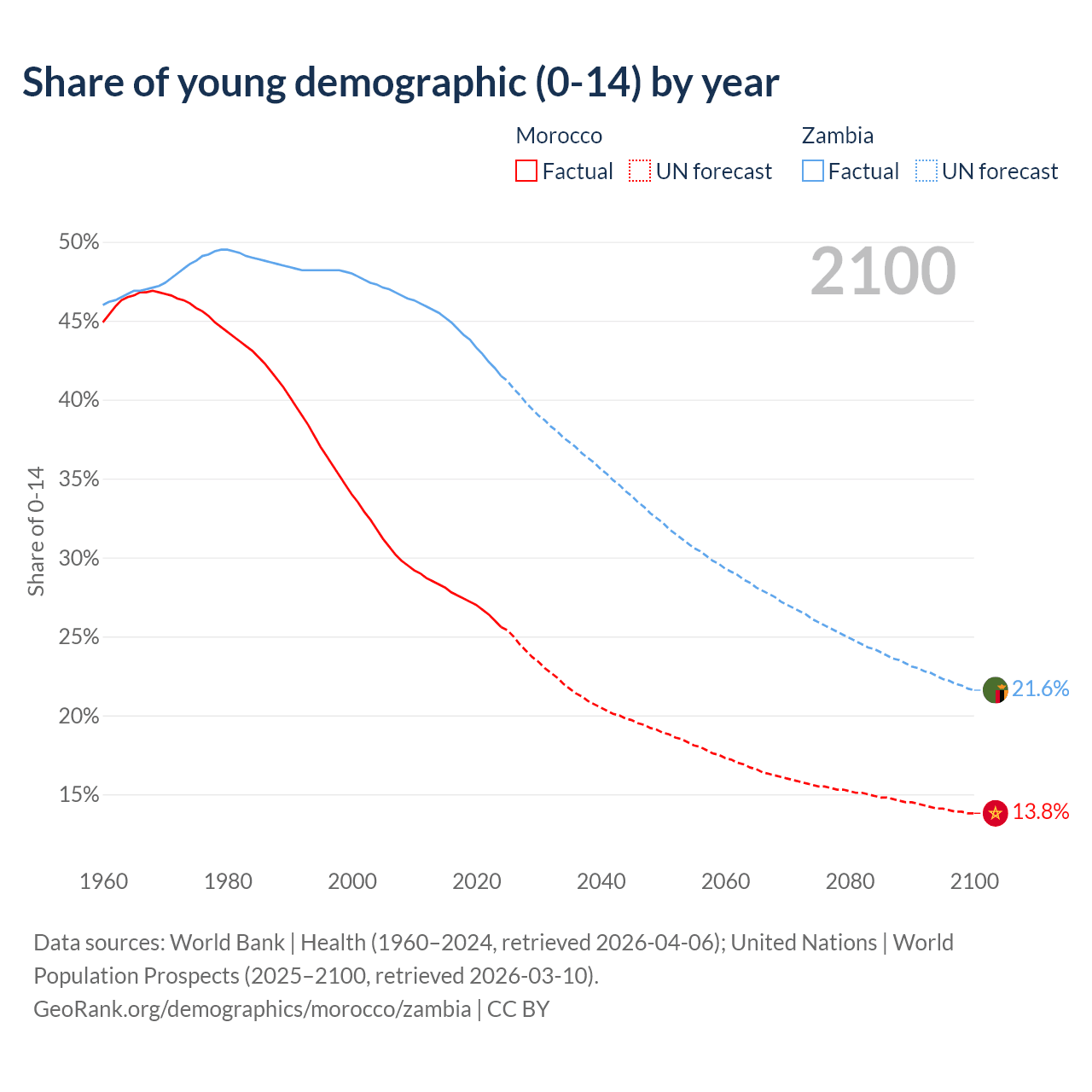 Median age Morocco vs Zambia, 1960-2100