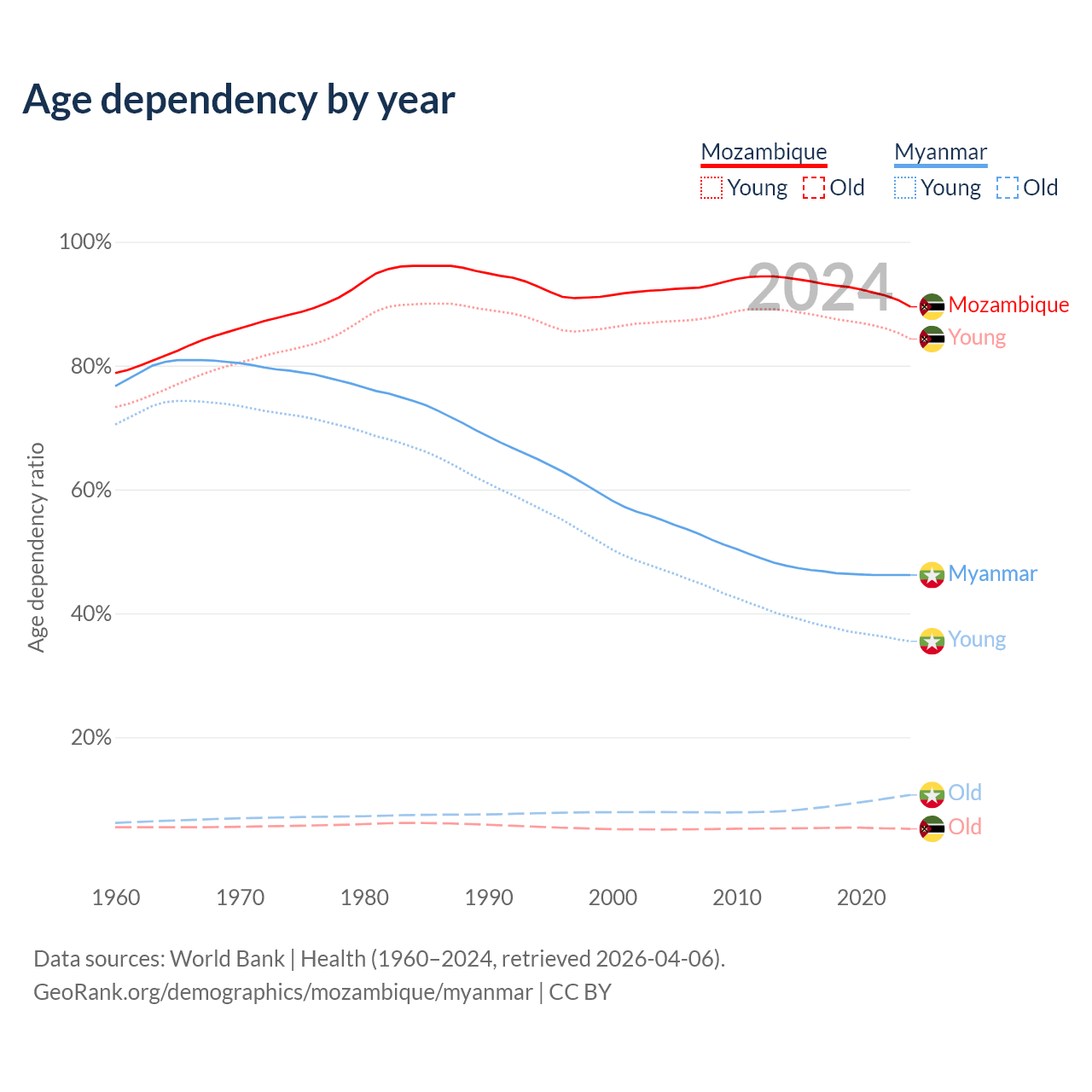 - Mozambique is ranked 189/196 by median age (oldest to youngest) vs 96/196 for Myanmar.