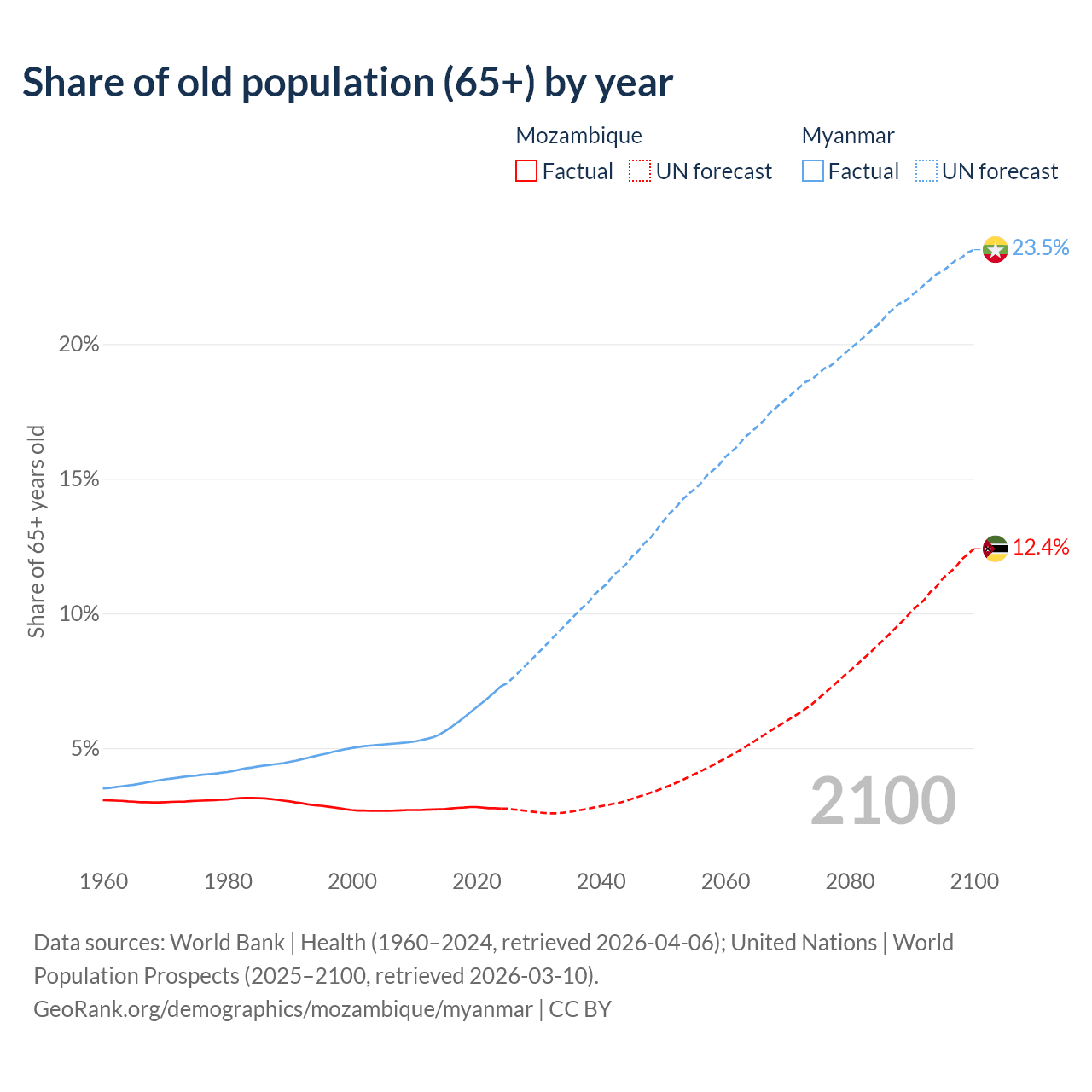 The share of older people aged 65 and over is 2.75% in Mozambique and 7.3% in Myanmar. Life expectancy in Mozambique compared to Myanmar .