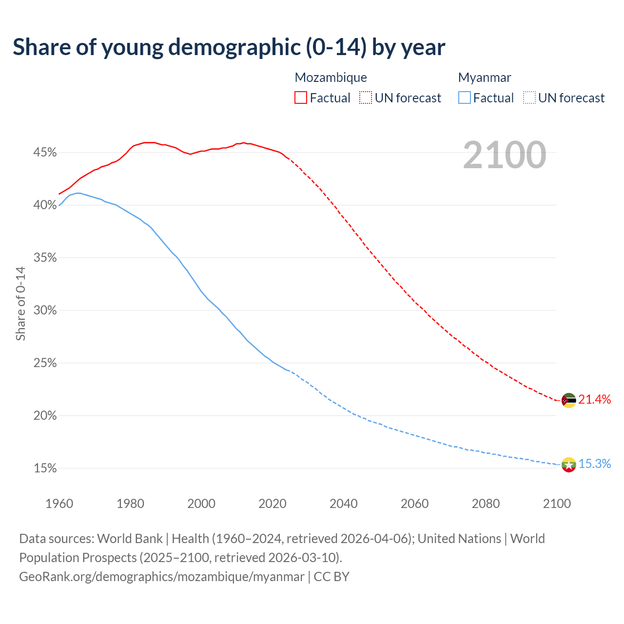 - The share of young demographic (0-15 years old) in Mozambique is 44.5% vs 24.3% in Myanmar.