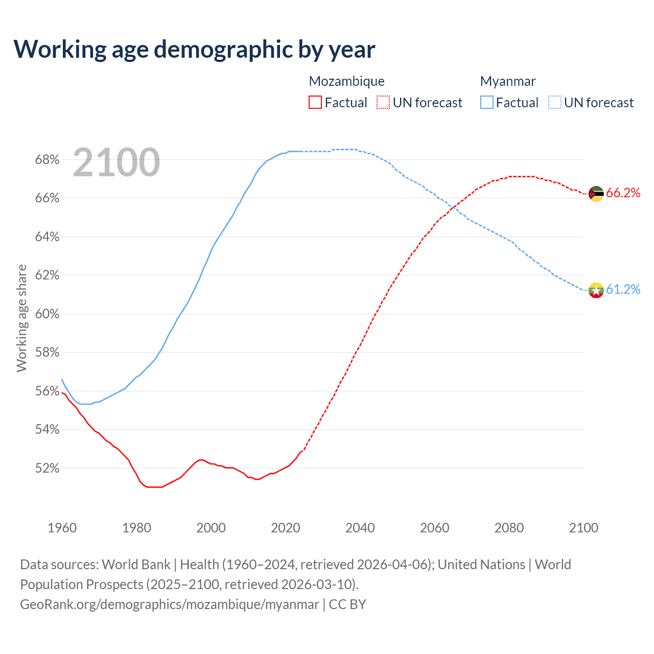 - As of 2026, the population of Mozambique is 36.9M vs 55.3M in Myanmar - 1.5 times difference.