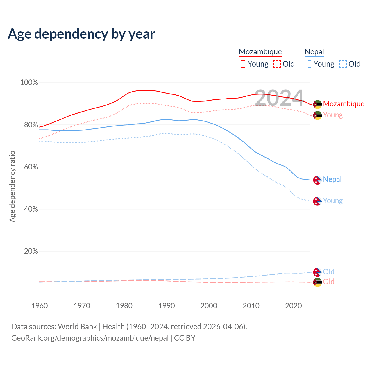 Data sources: World Bank | Health (1960–2024, retrieved 2026-04-06); U.S. Census Bureau (1960–2024, retrieved 2026-02-08).