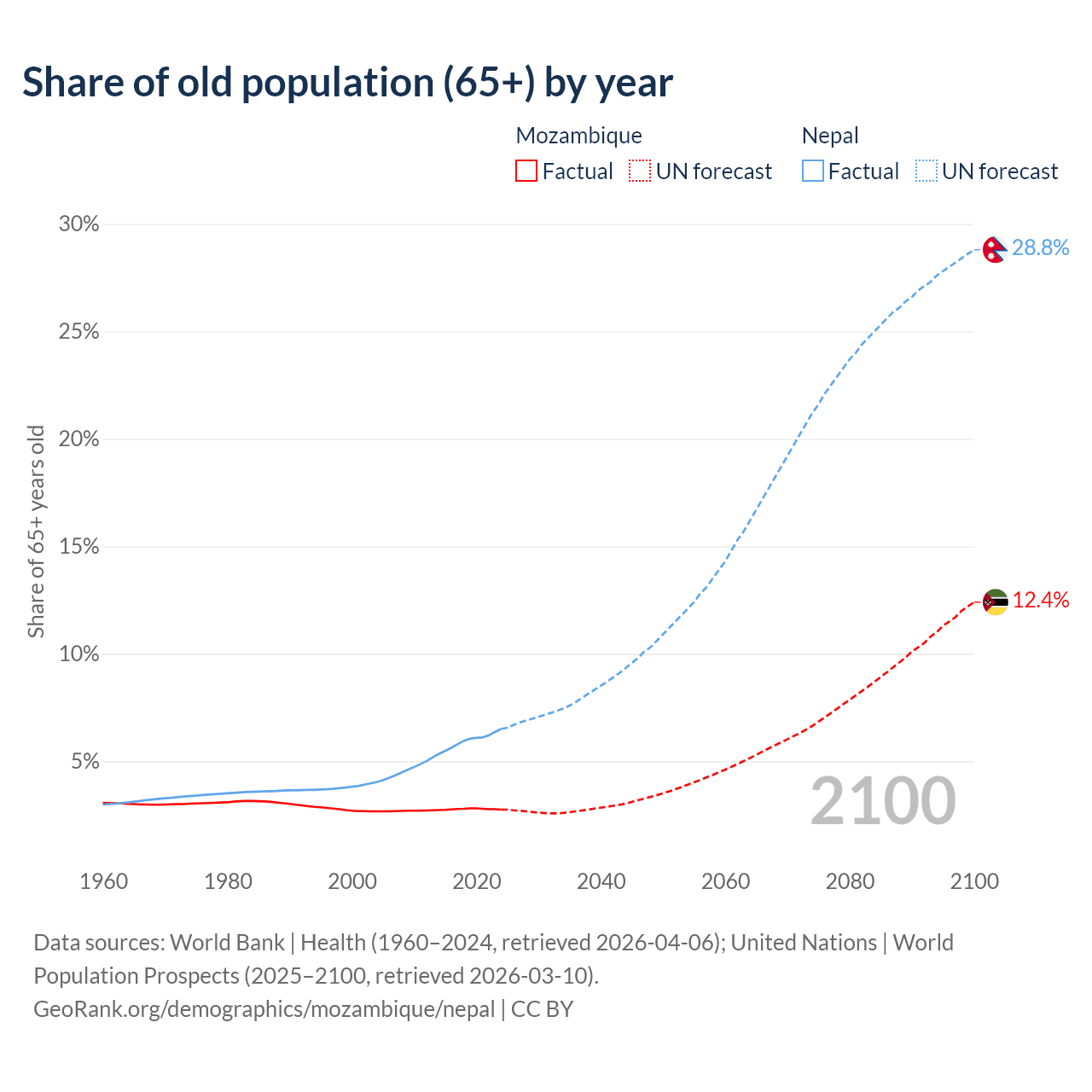 The share of older people aged 65 and over is 2.75% in Mozambique and 6.5% in Nepal. Life expectancy in Mozambique compared to Nepal .