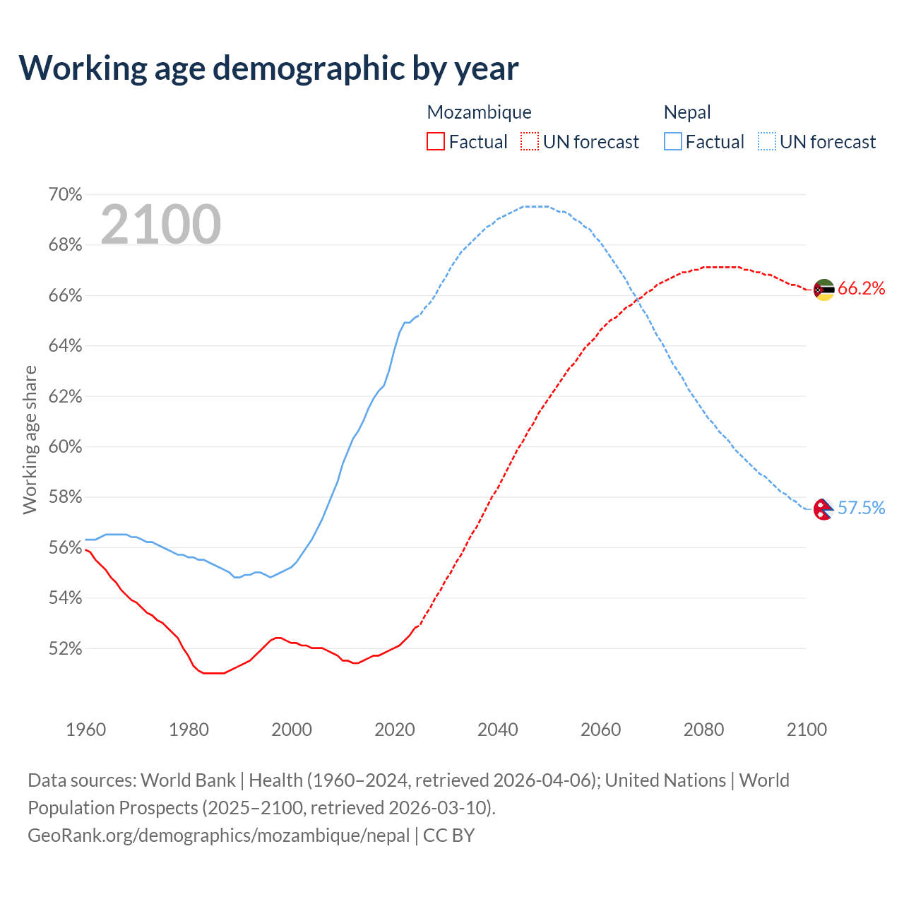 Median age Mozambique vs Nepal, 1960-2100