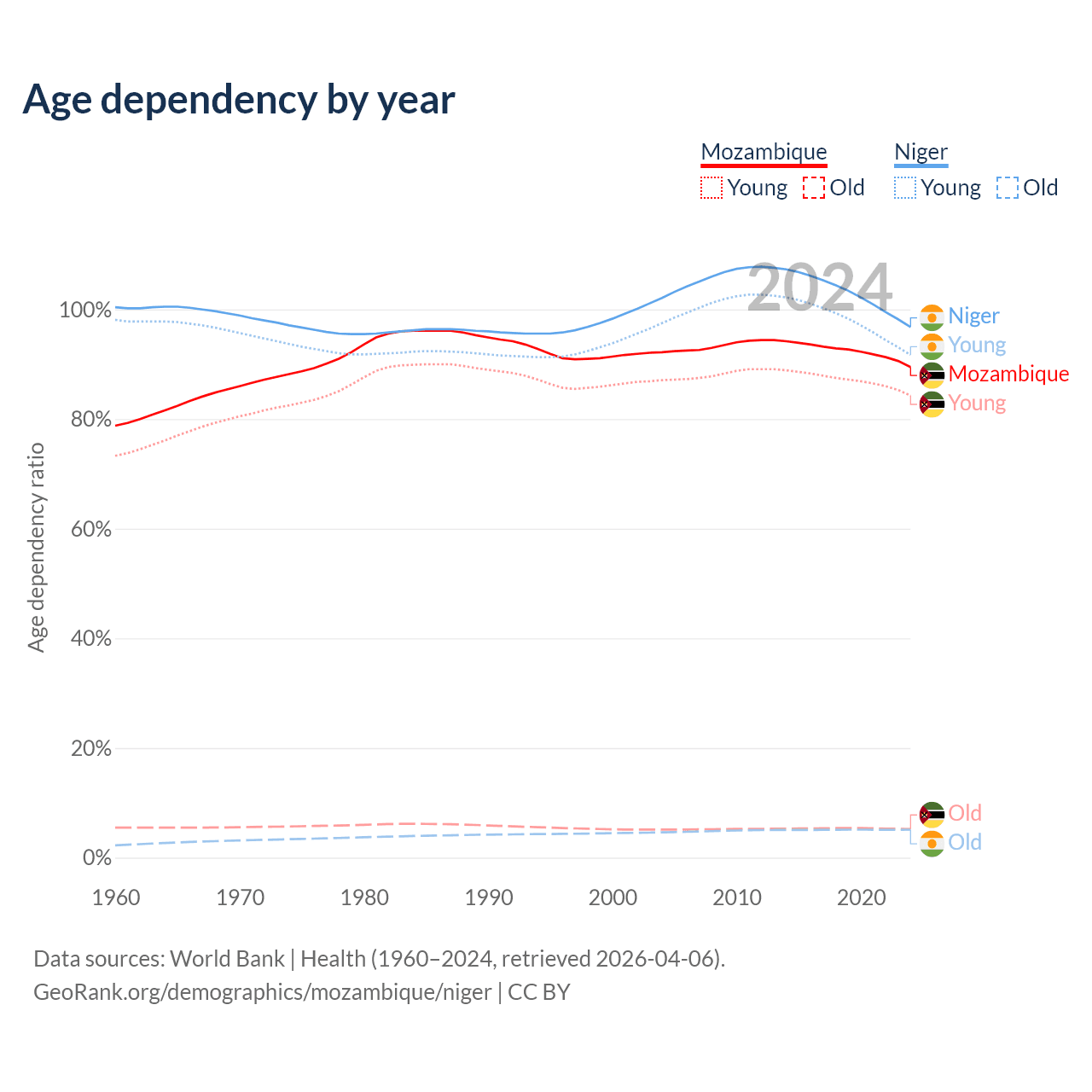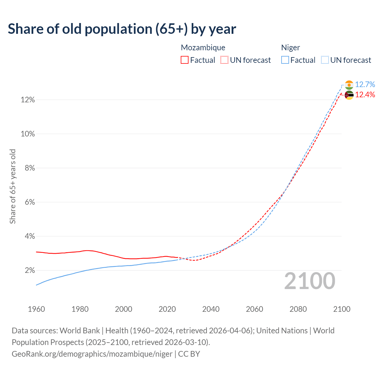 - The share of old-age demographic (65+) in Mozambique is 2.75% vs 2.59% in Niger.