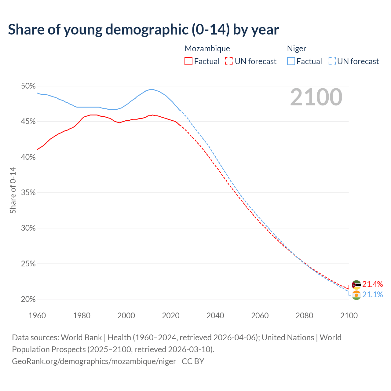 - The share of young demographic (0-15 years old) in Mozambique is 44.5% vs 46.6% in Niger.