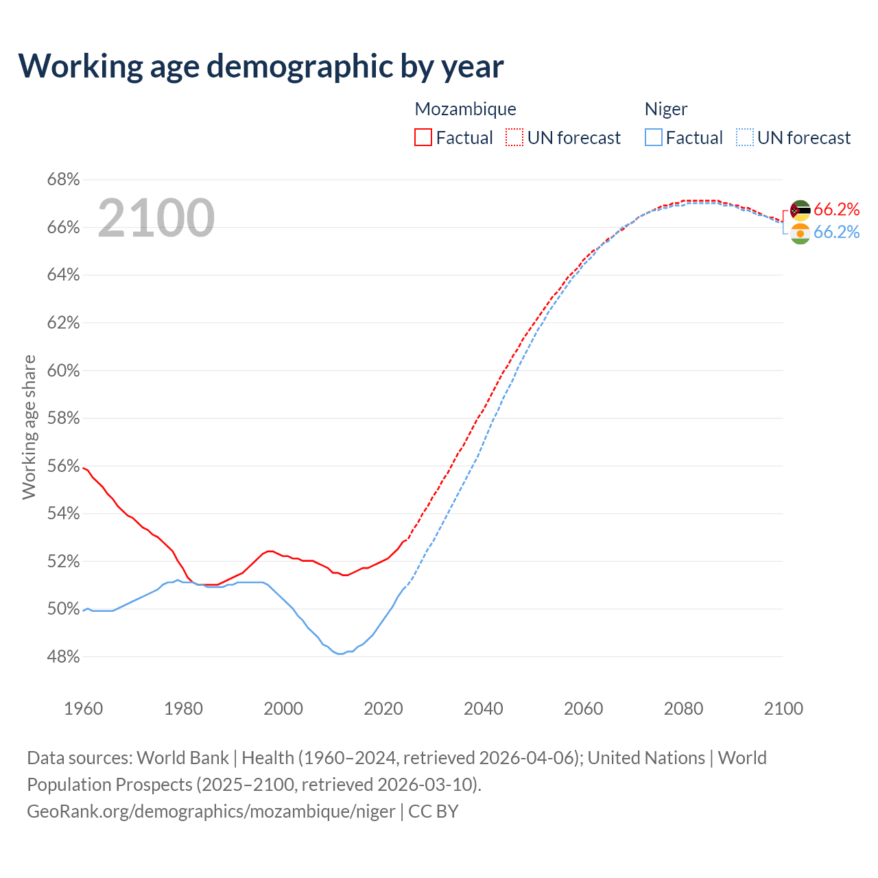 - Mozambique has 19.5M working age adults (aged 15-64) vs 14.8M in Niger.