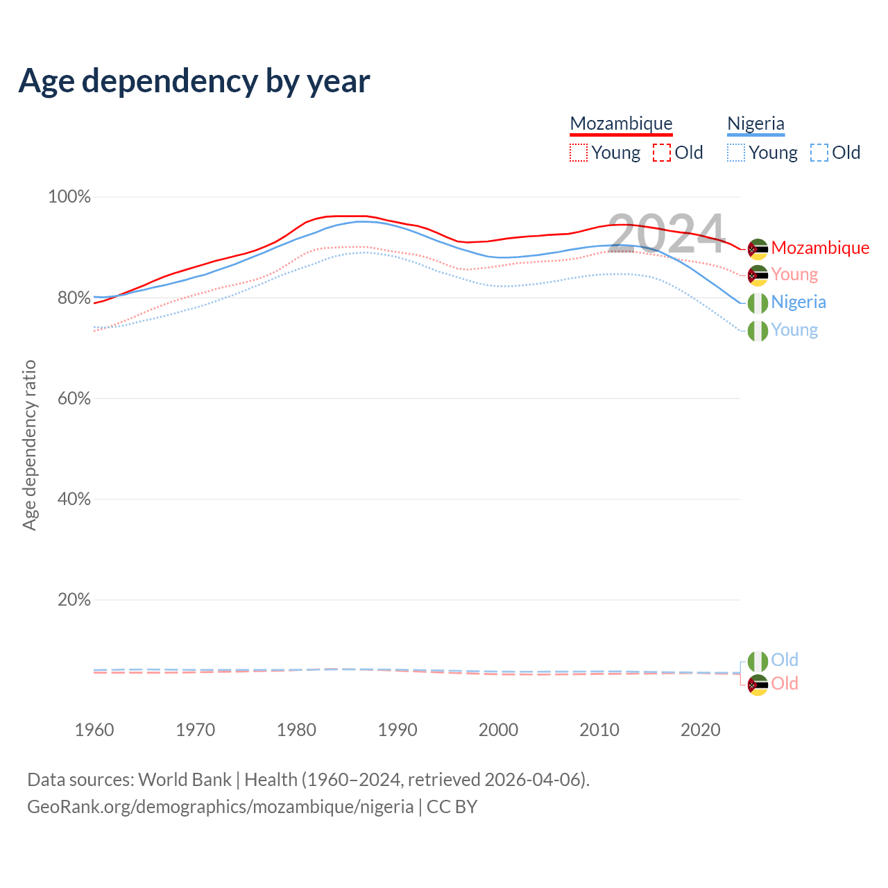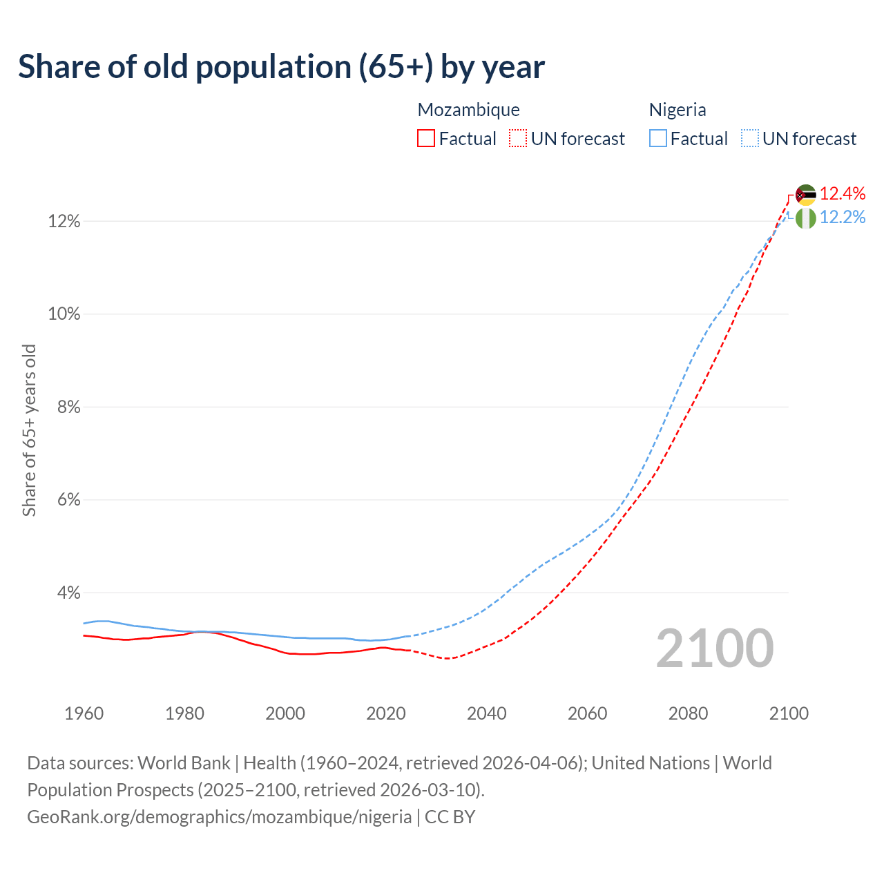 The share of older people aged 65 and over is 2.75% in Mozambique and 3.05% in Nigeria. Life expectancy in Mozambique compared to Nigeria .