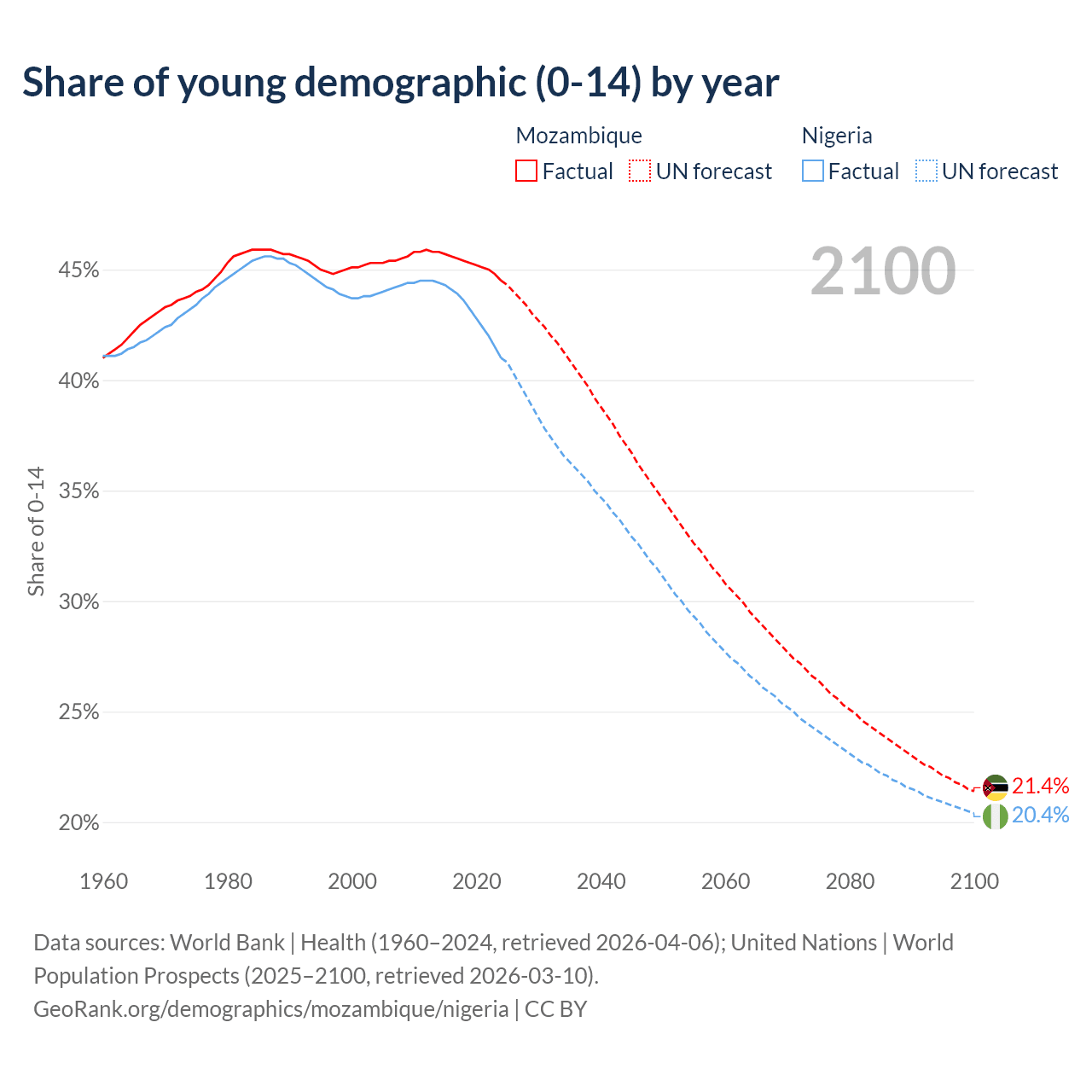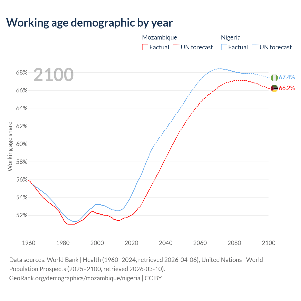 Median age Mozambique vs Nigeria, 1960-2100