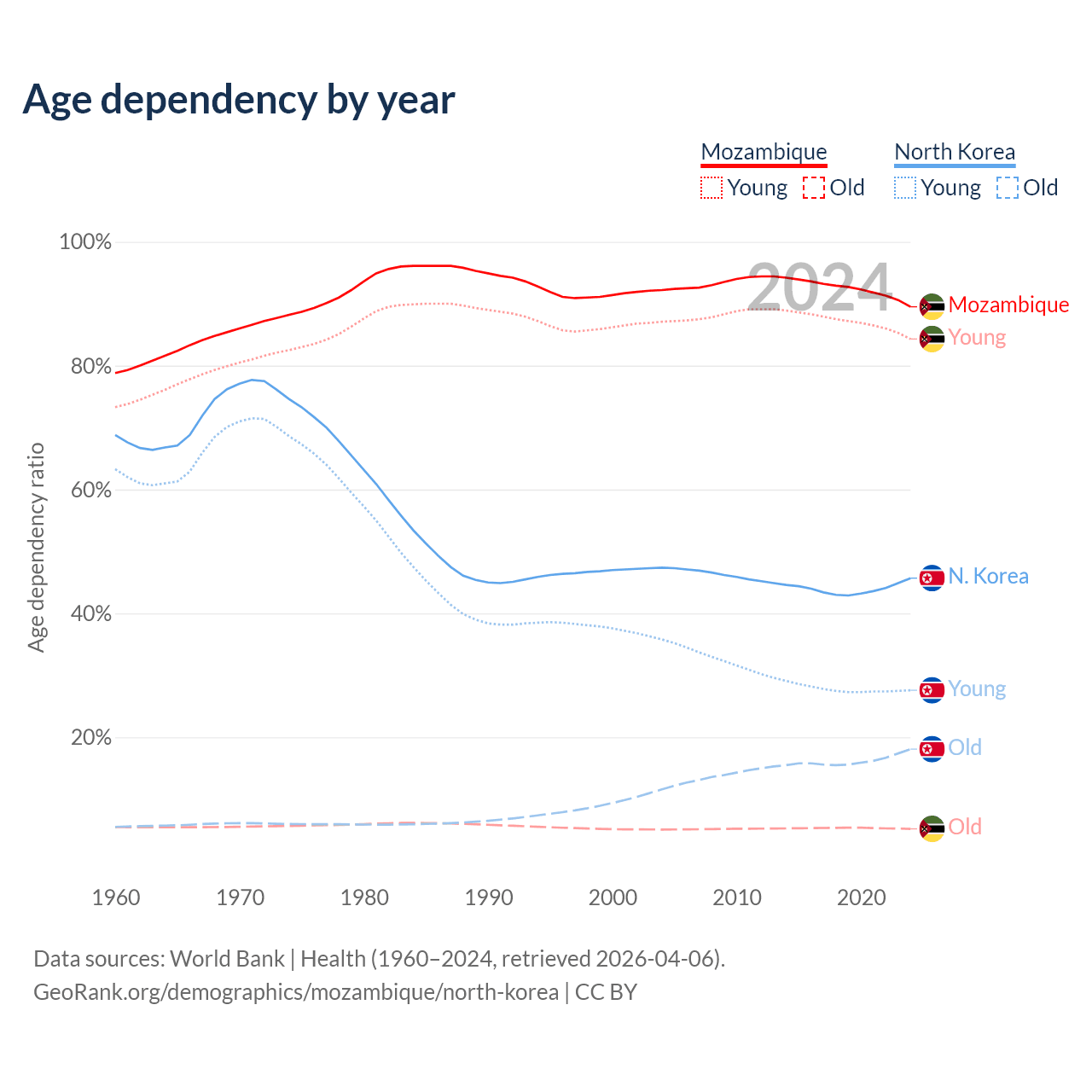 - The share of old-age demographic (65+) in Mozambique is 2.75% vs 12.4% in North Korea.