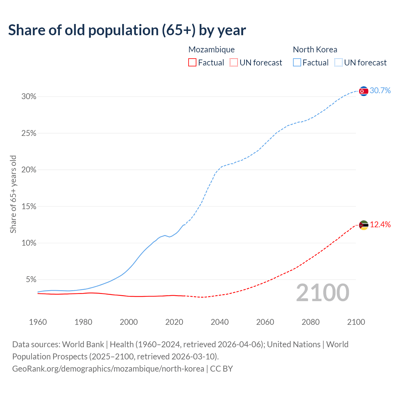 The share of older people aged 65 and over is 2.75% in Mozambique and 12.4% in North Korea. Life expectancy in Mozambique compared to North Korea .