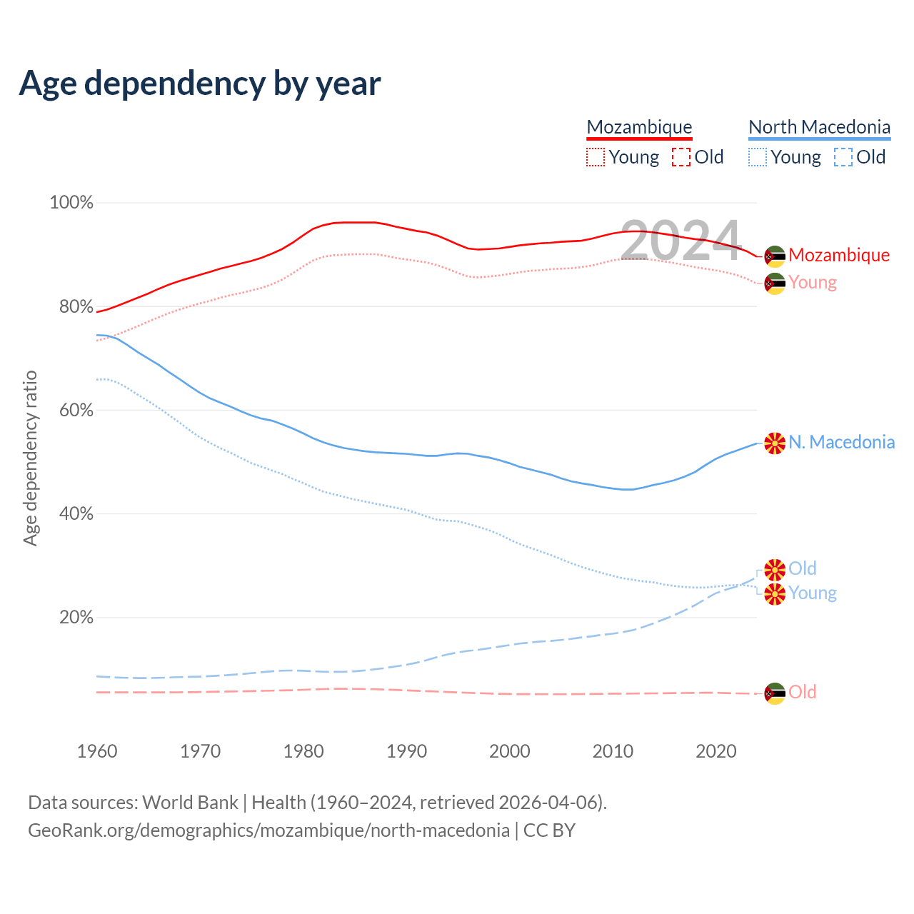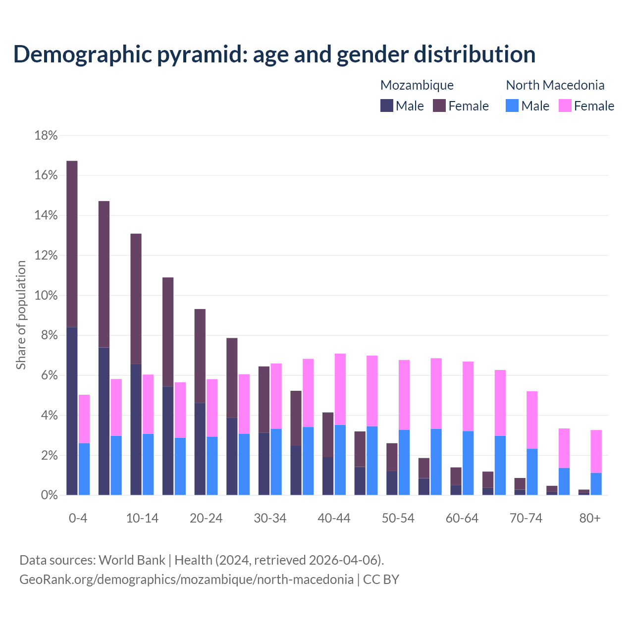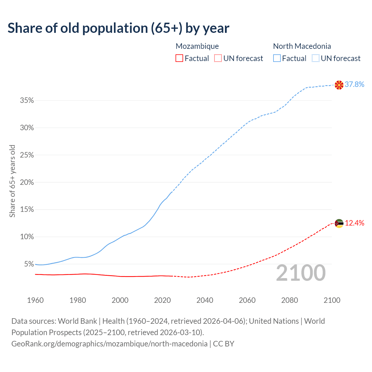 The share of older people aged 65 and over is 2.75% in Mozambique and 18% in North Macedonia. Life expectancy in Mozambique compared to North Macedonia .