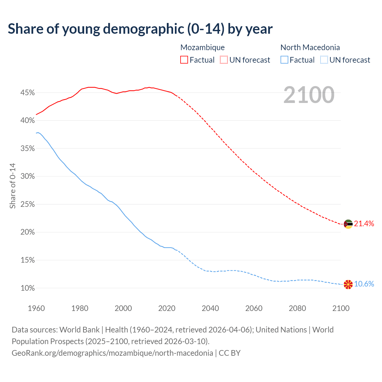 - The share of young demographic (0-15 years old) in Mozambique is 44.5% vs 16.8% in North Macedonia.